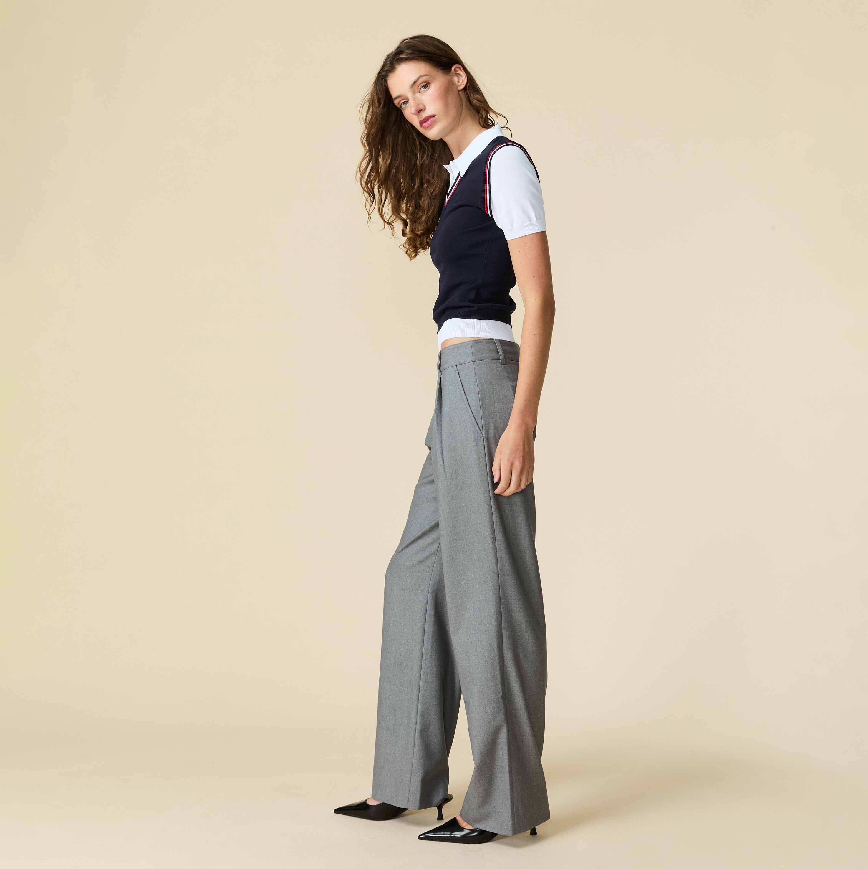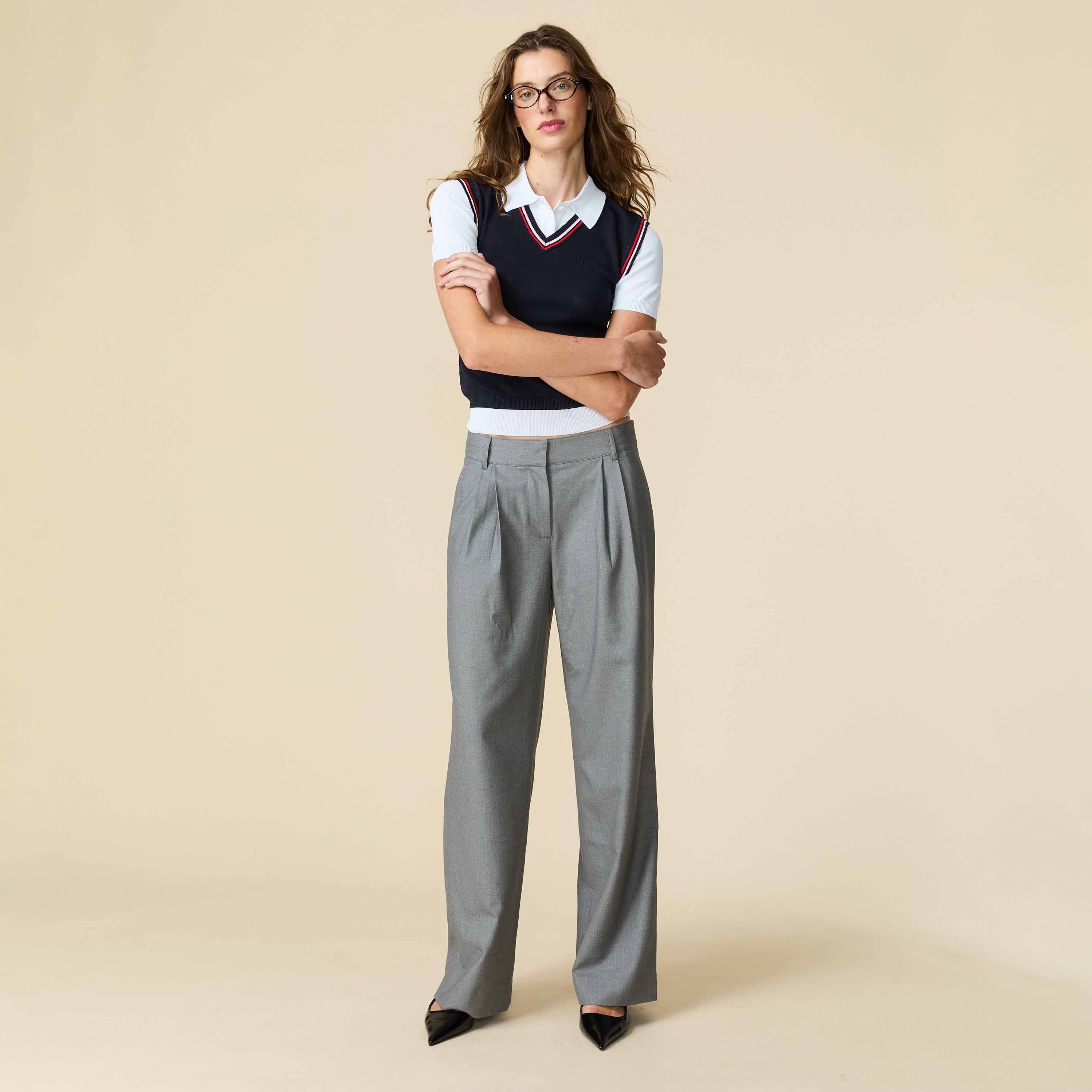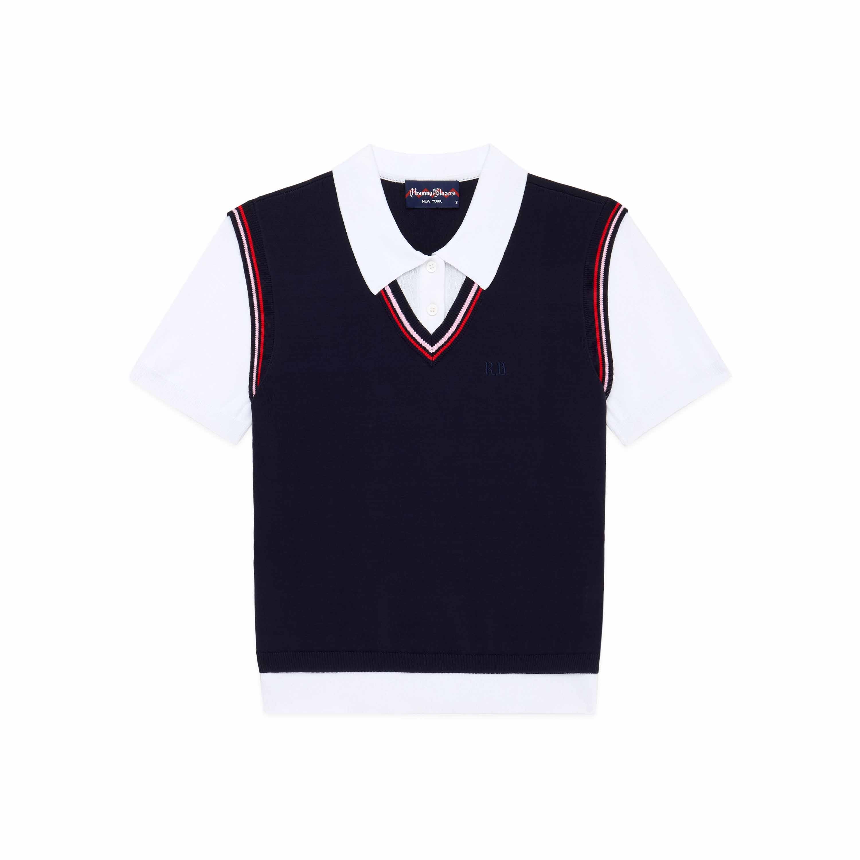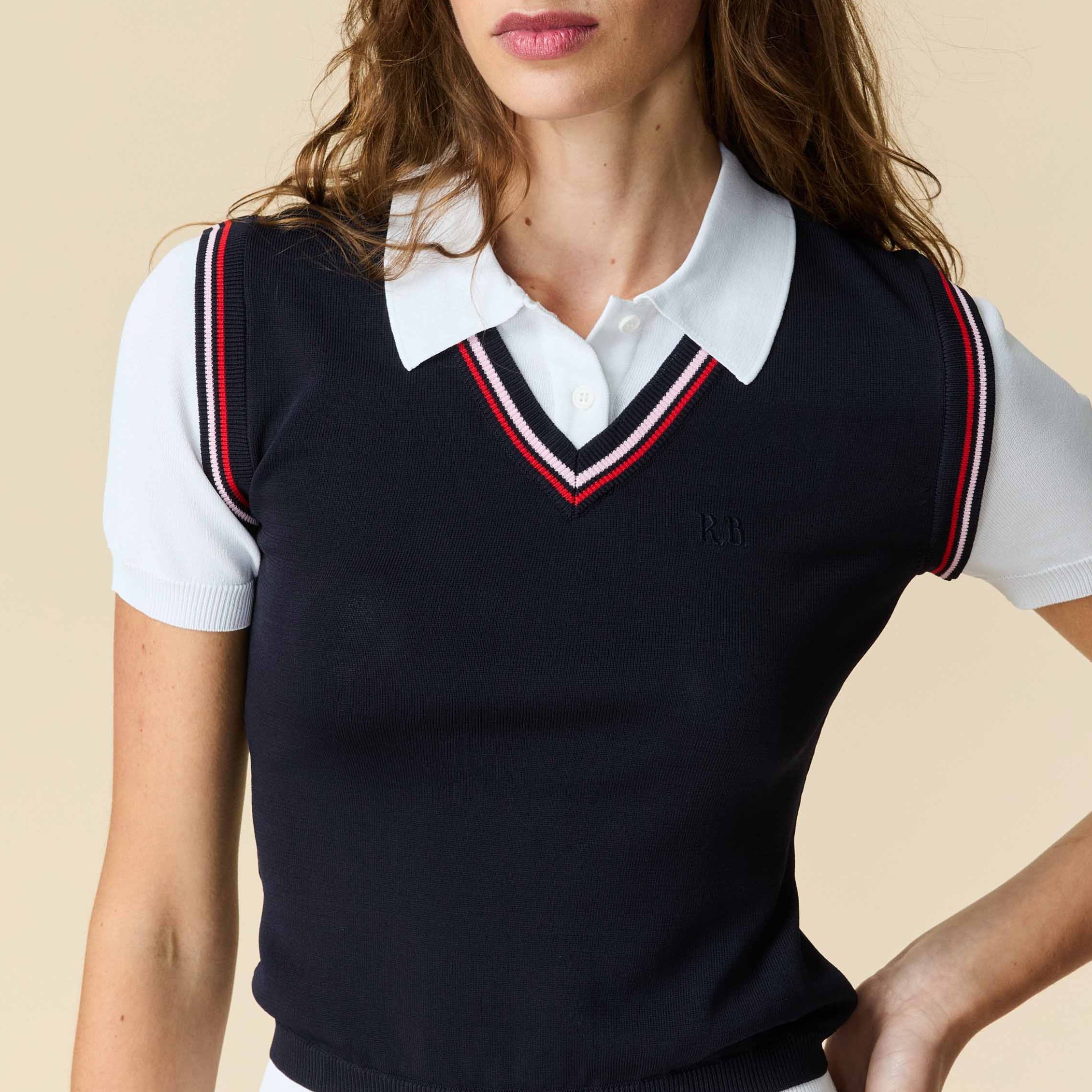 - Women’s soft and silky one-piece polo/sweater vest combination with contrasting trim and embroidered detailing