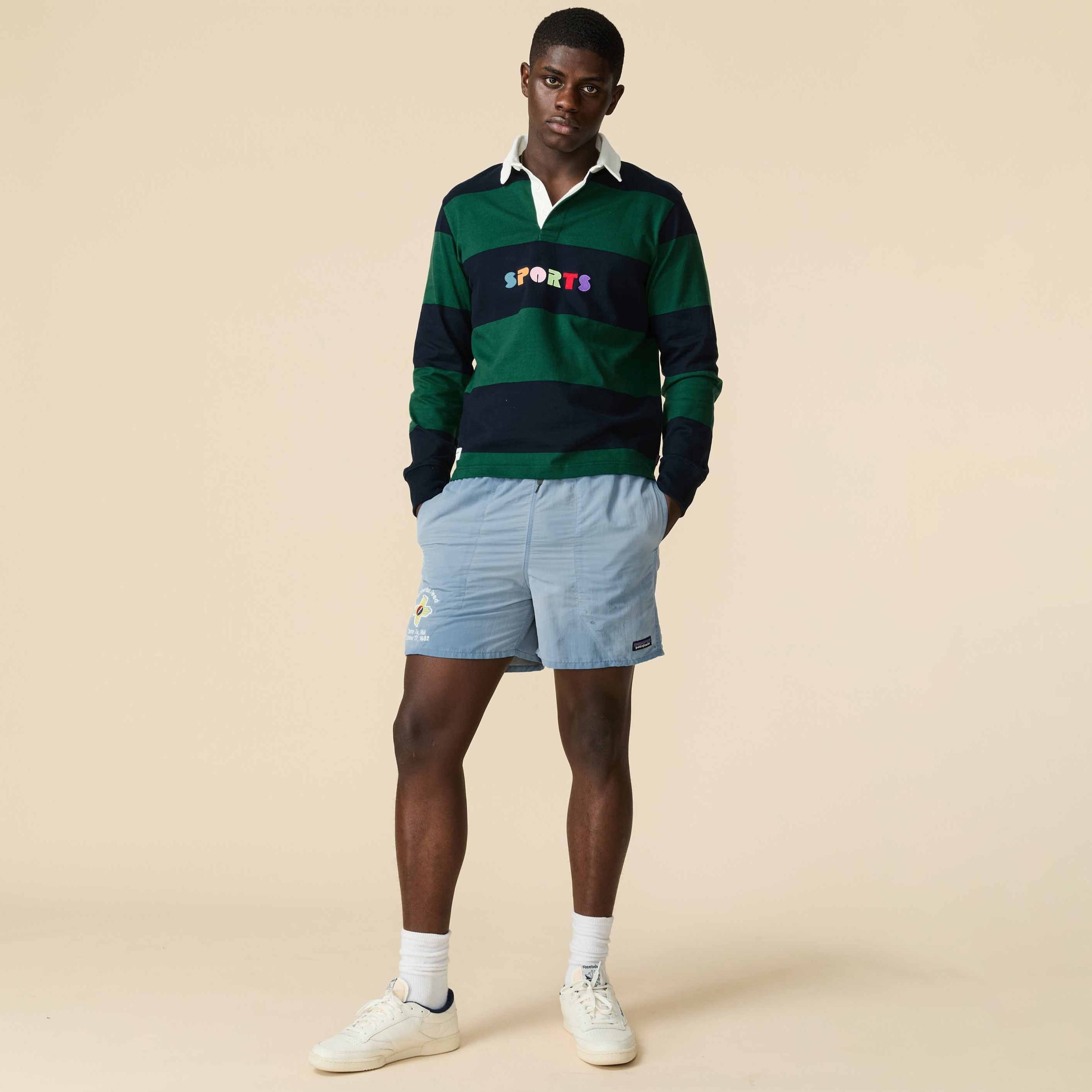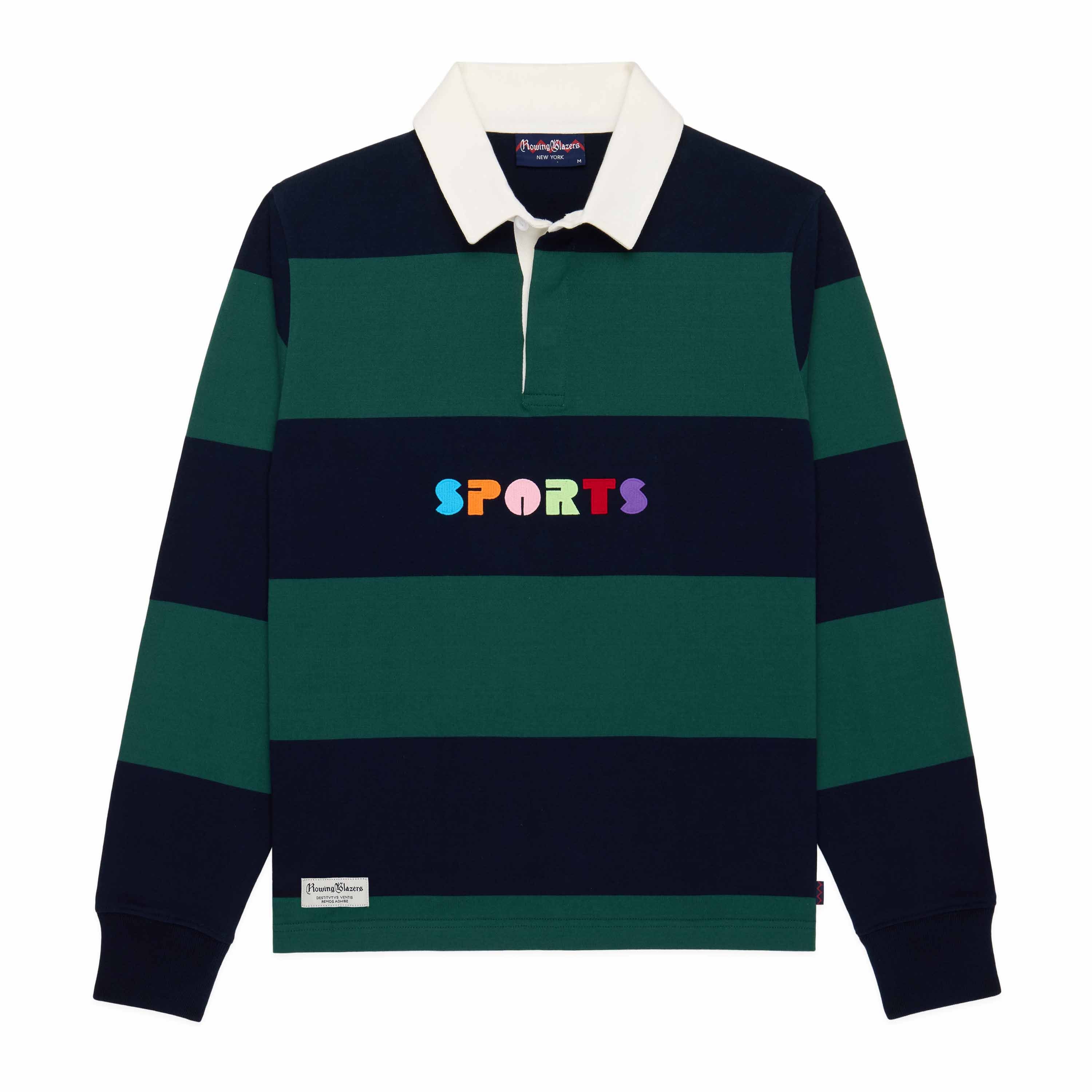 - Men’s heavyweight organic cotton rugby shirt with an embroidered retro-inspired “SPORTS” motif