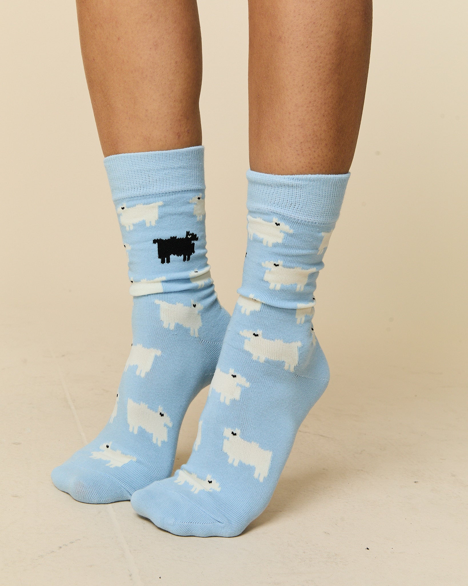 • Classic crew socks featuring Warm & Wonderful’s iconic “Black Sheep” pattern