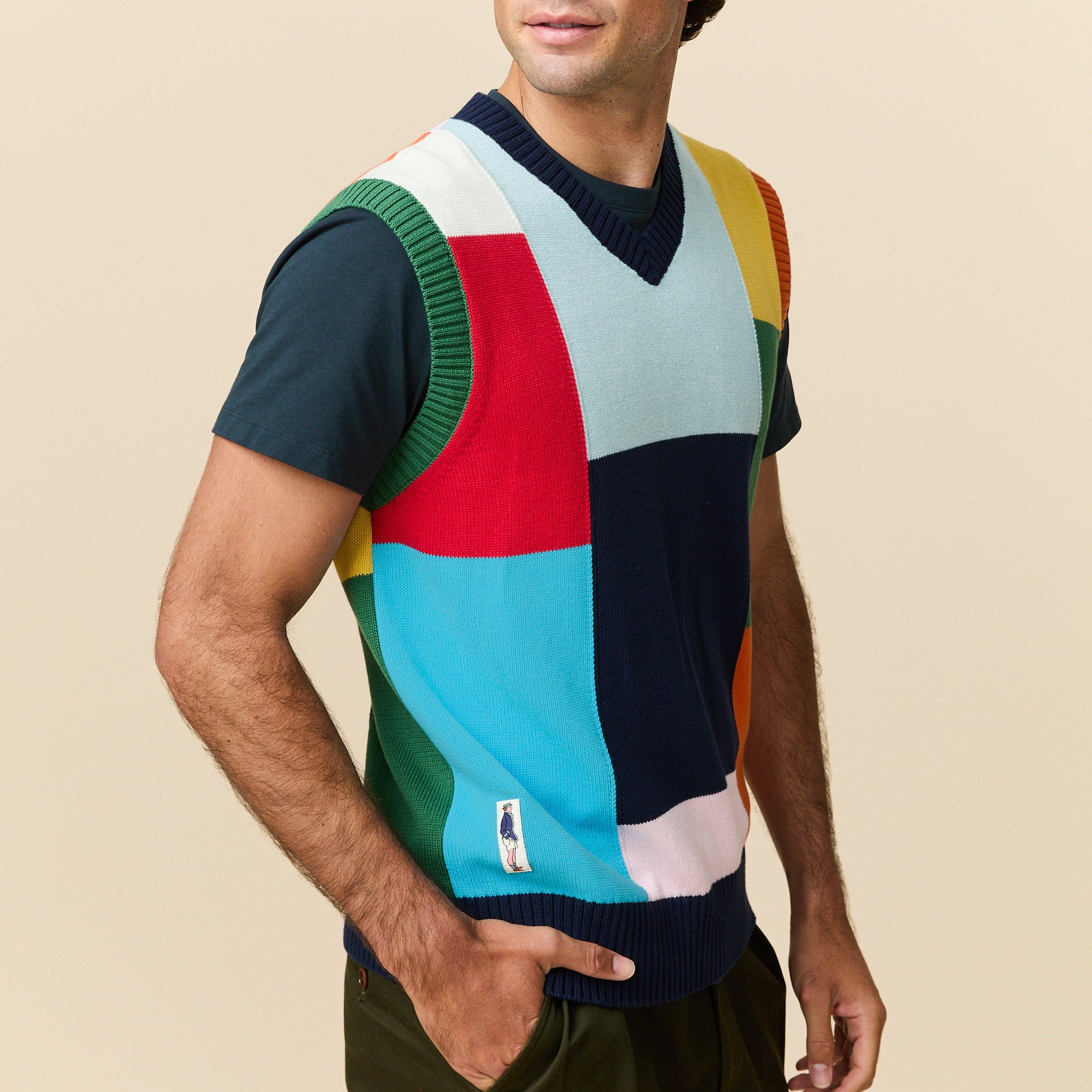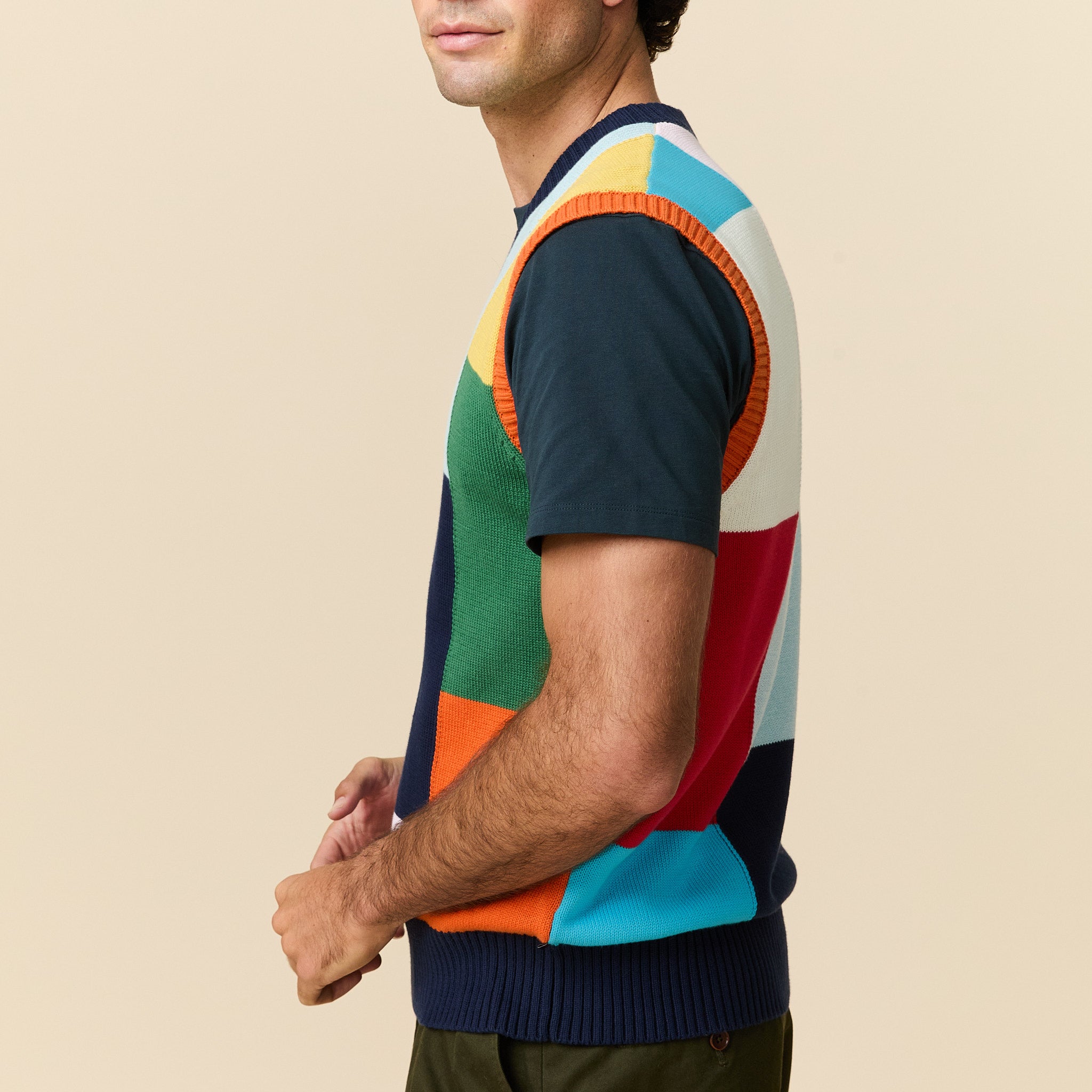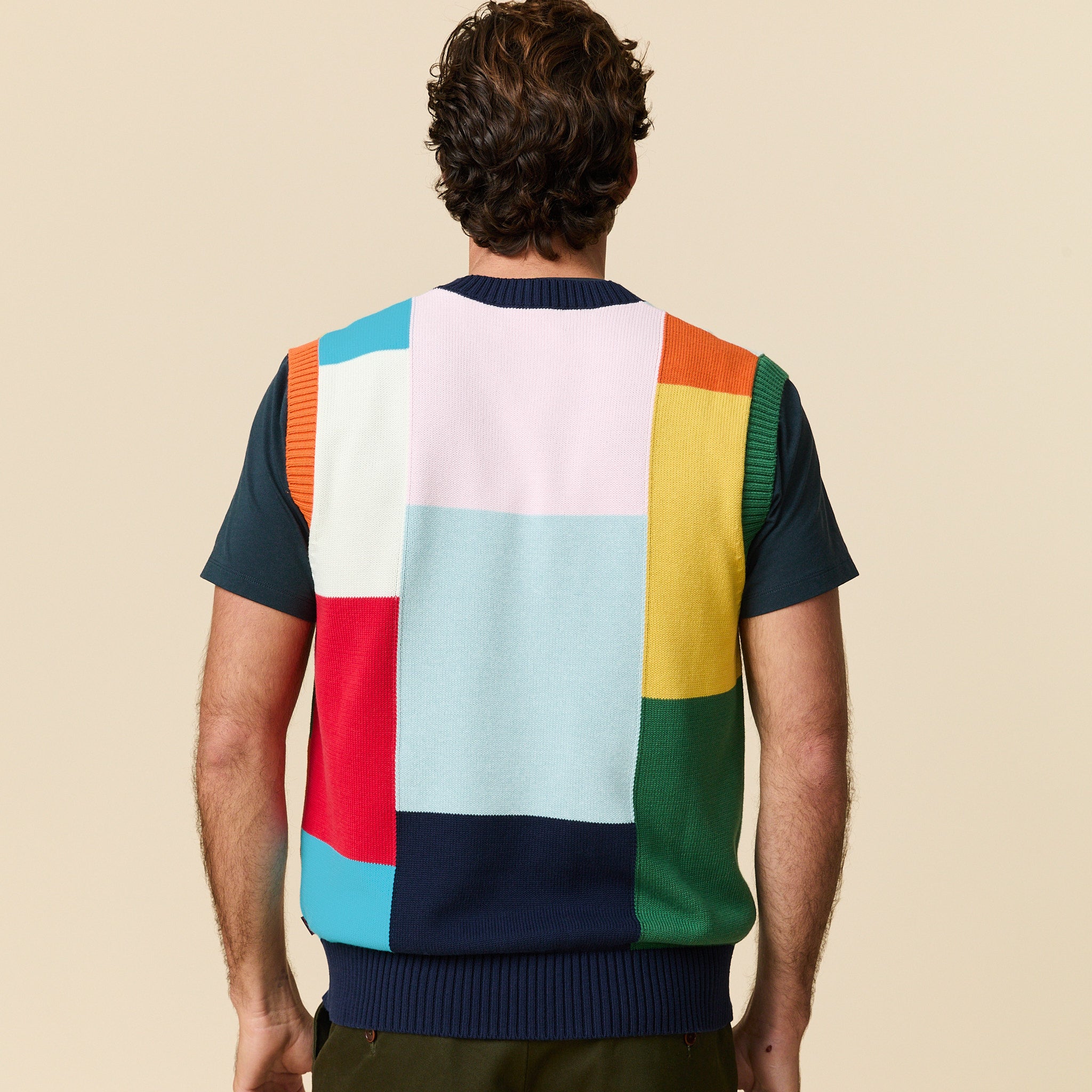 • Cotton v-neck sweater vest with a pastel colorblocking motif