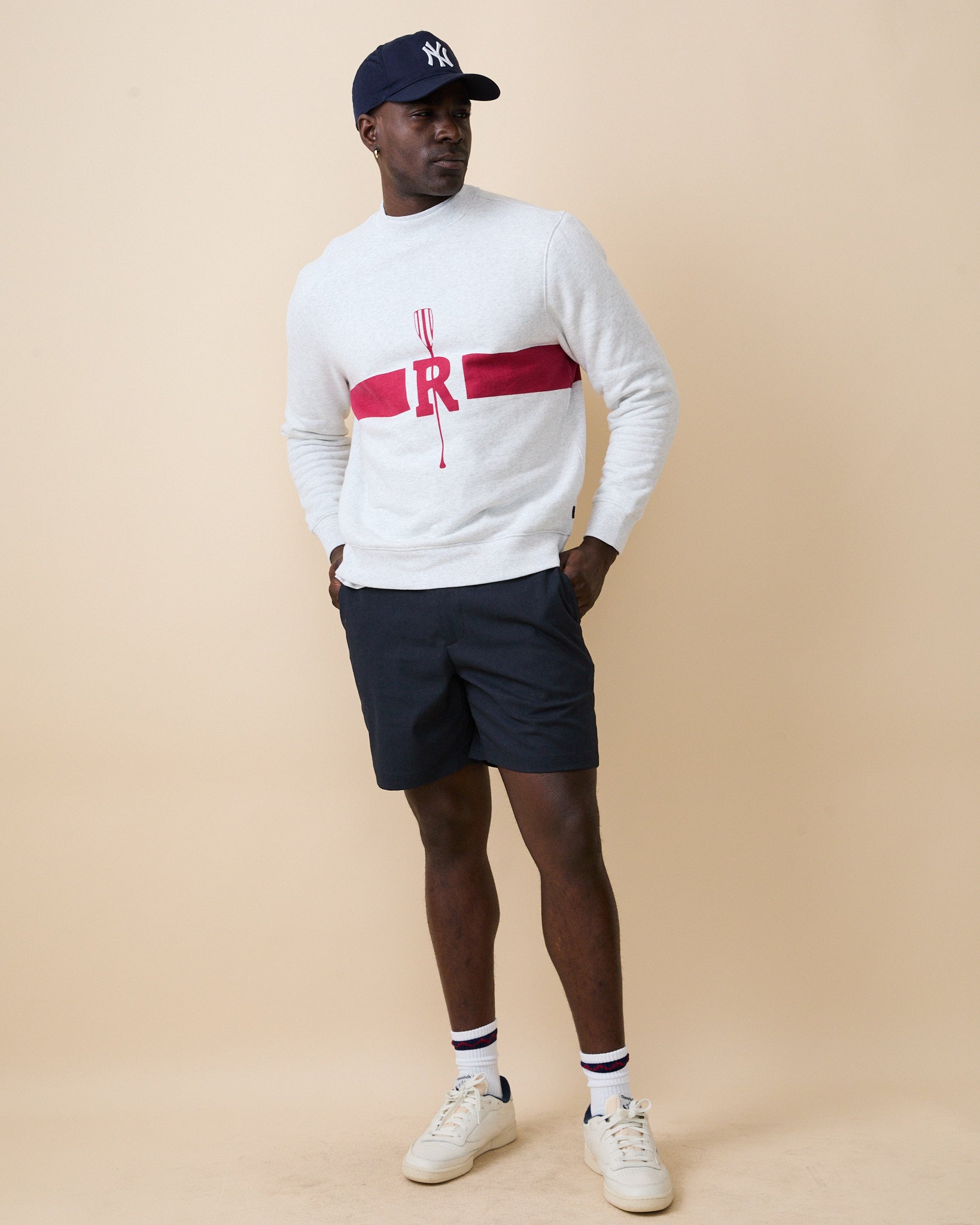 • Classic oar motif and bold red “R” with thick red stripe