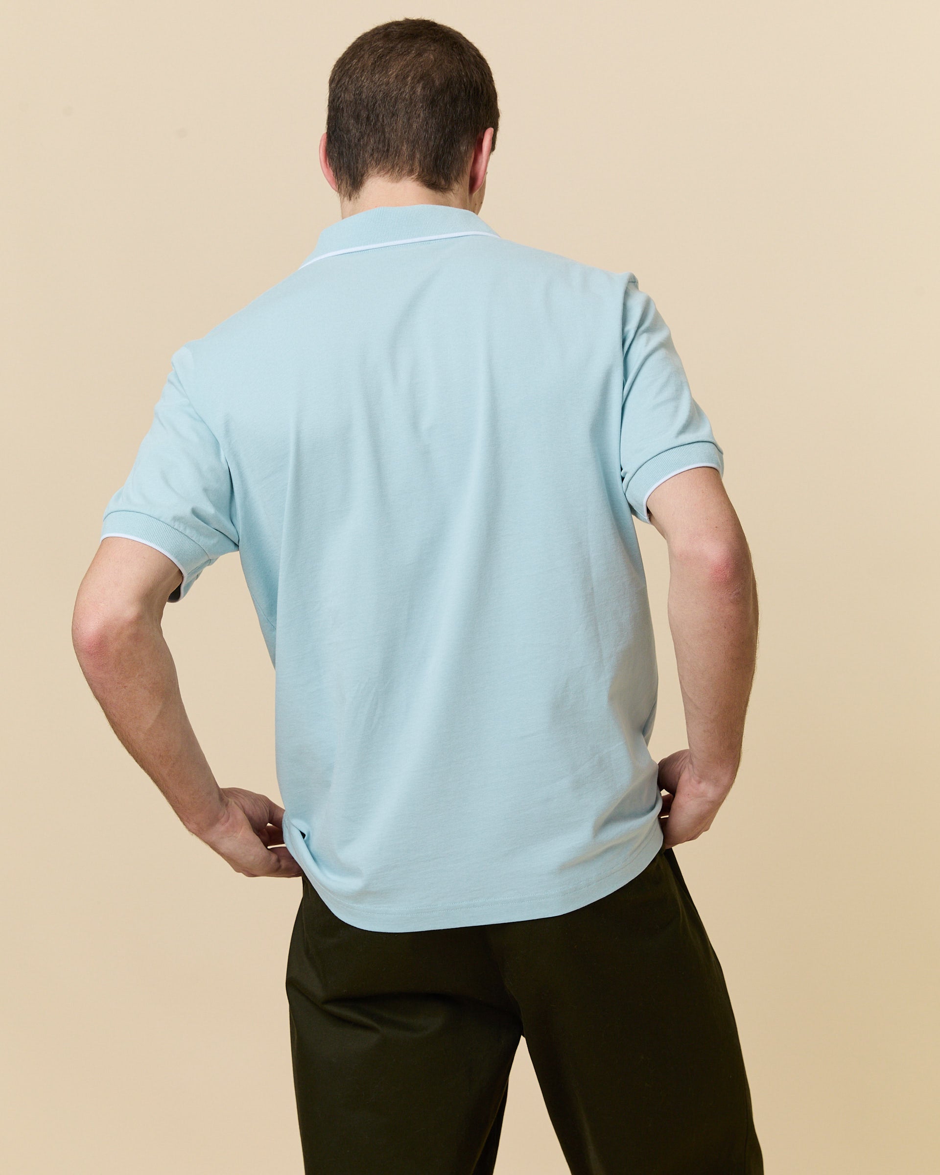 - Two-button placket. Pressed cotton buttons. Flat-knit rib collar and 1x1 ribbed armbands. Split hems