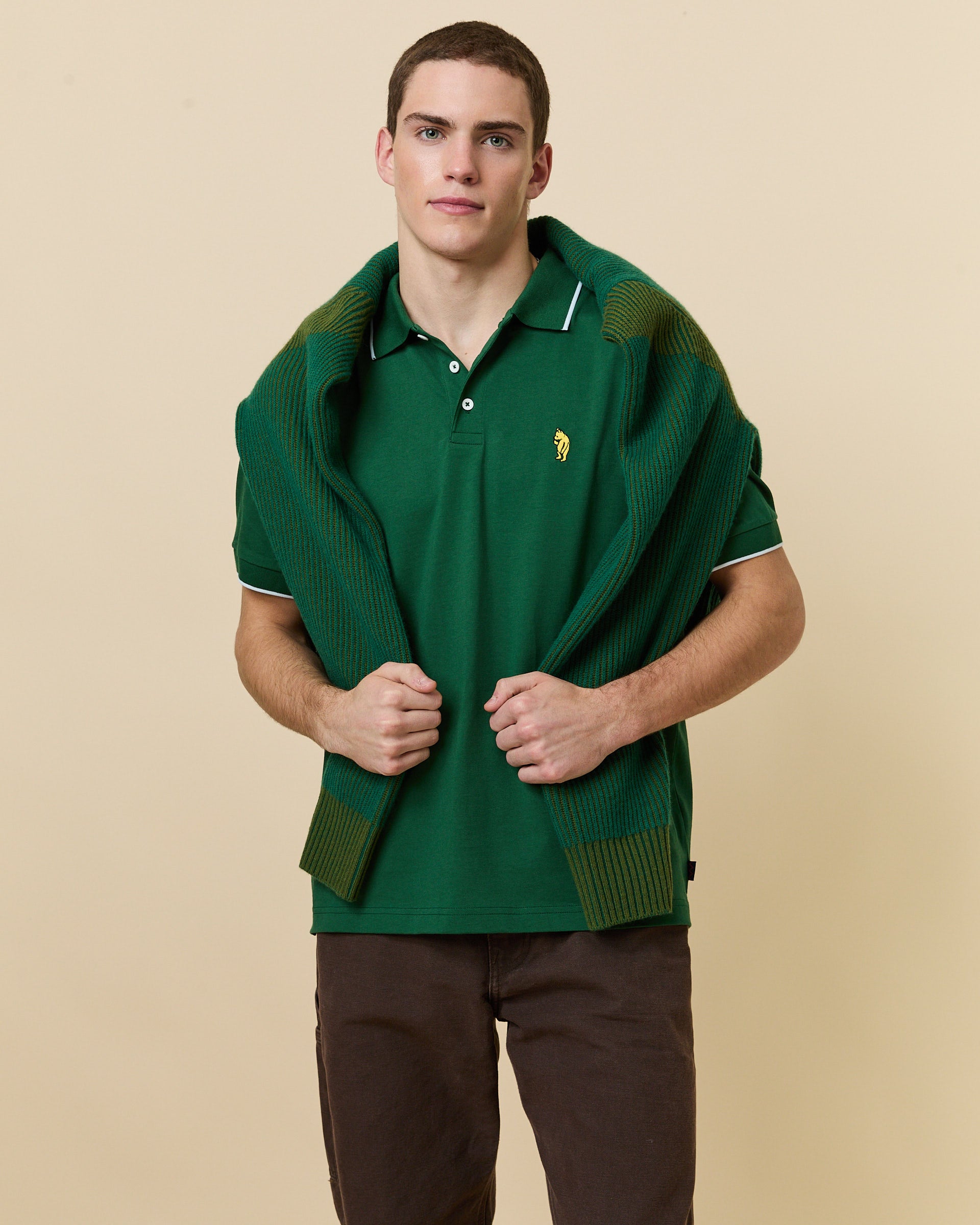 • Two-button placket. Pressed cotton buttons. Flat-knit rib collar and 1x1 ribbed armbands. Split hems