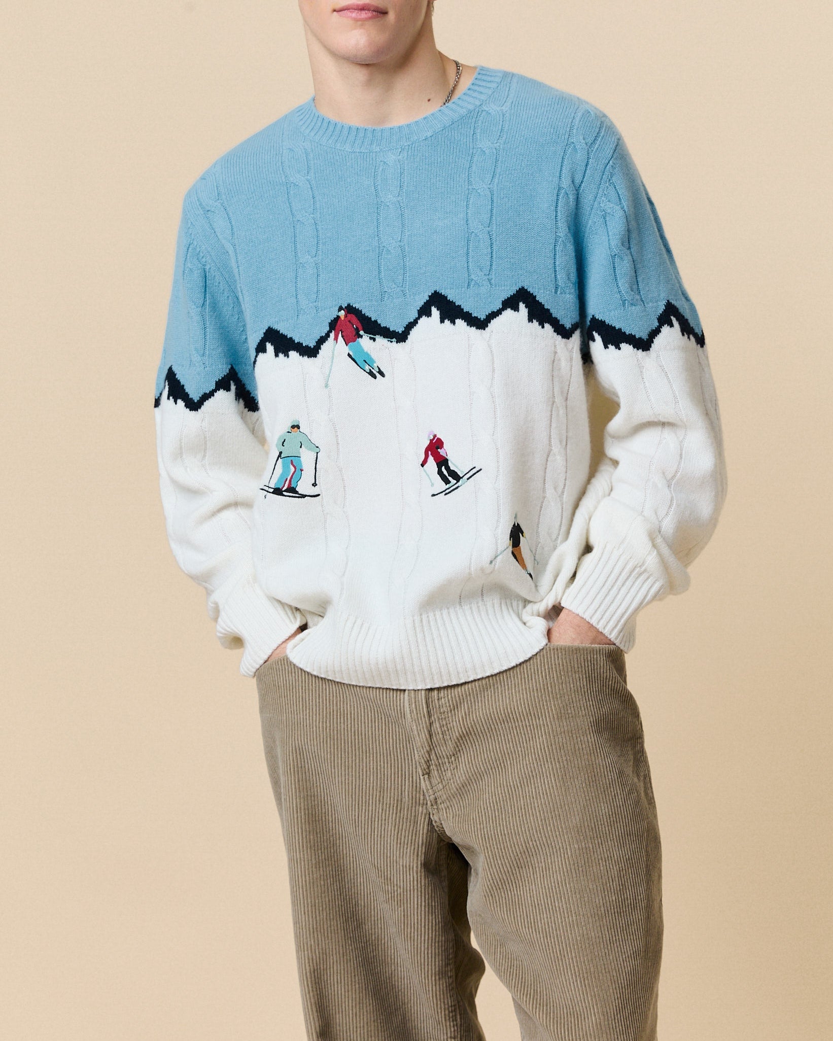 - Men’s wool-and-cashmere blend cable-knit crewneck sweater with an embroidered vintage-inspired après-ski motif Cable-knit.