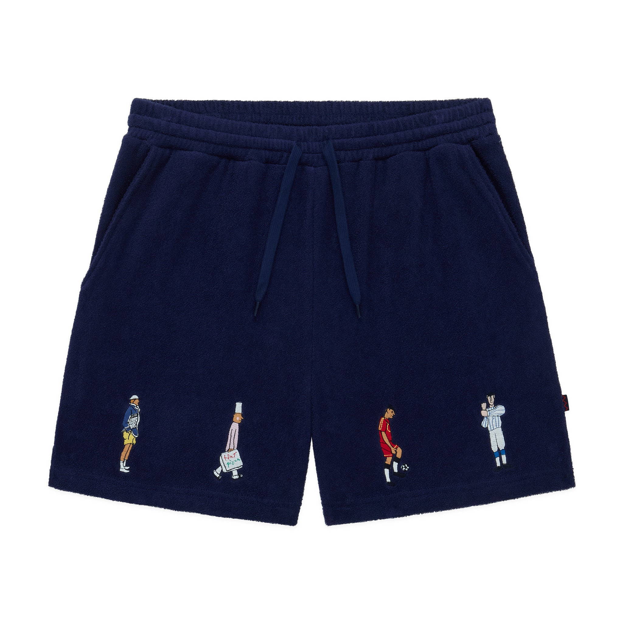 • Terrycloth pull-on shorts with embroidered detailing around the leg openings