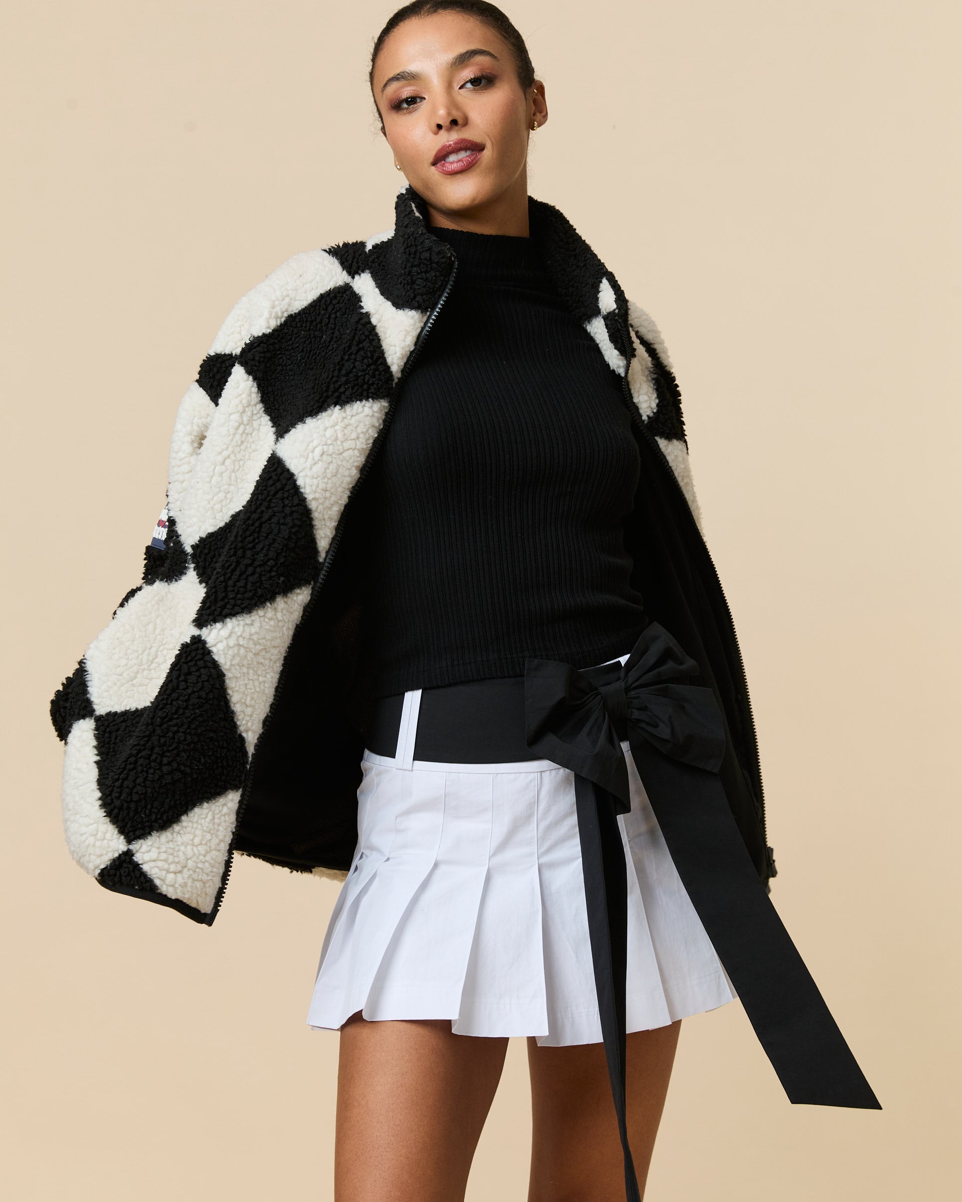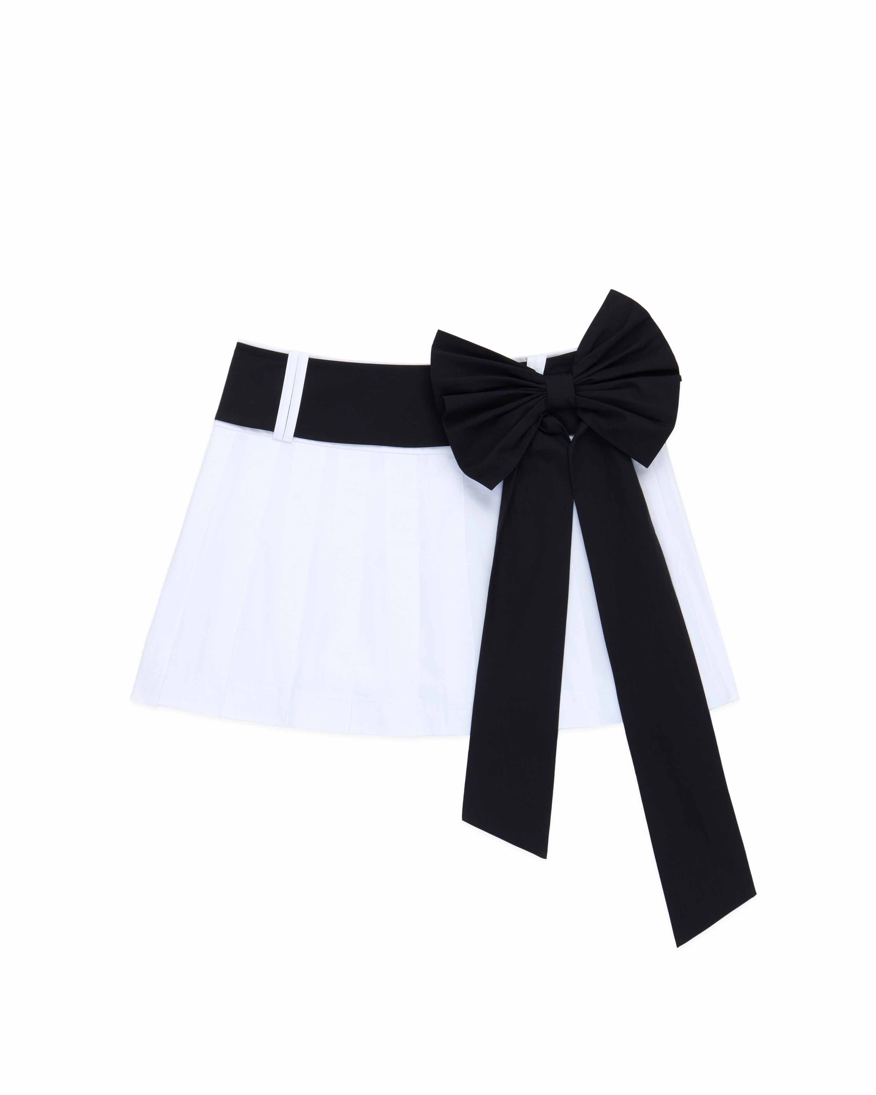 - Women’s pleated mini-skirt with an oversized bow at the left hip