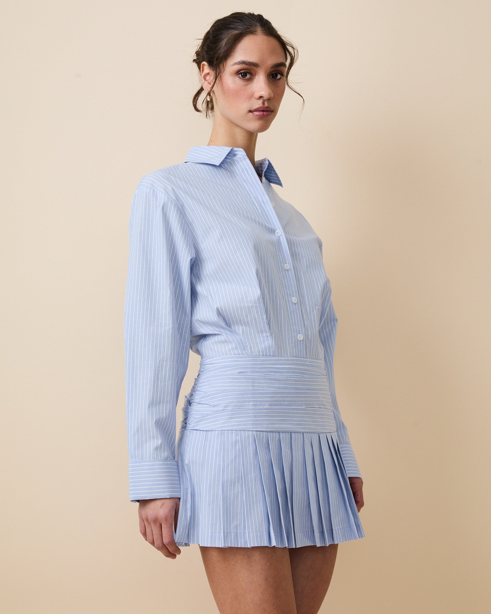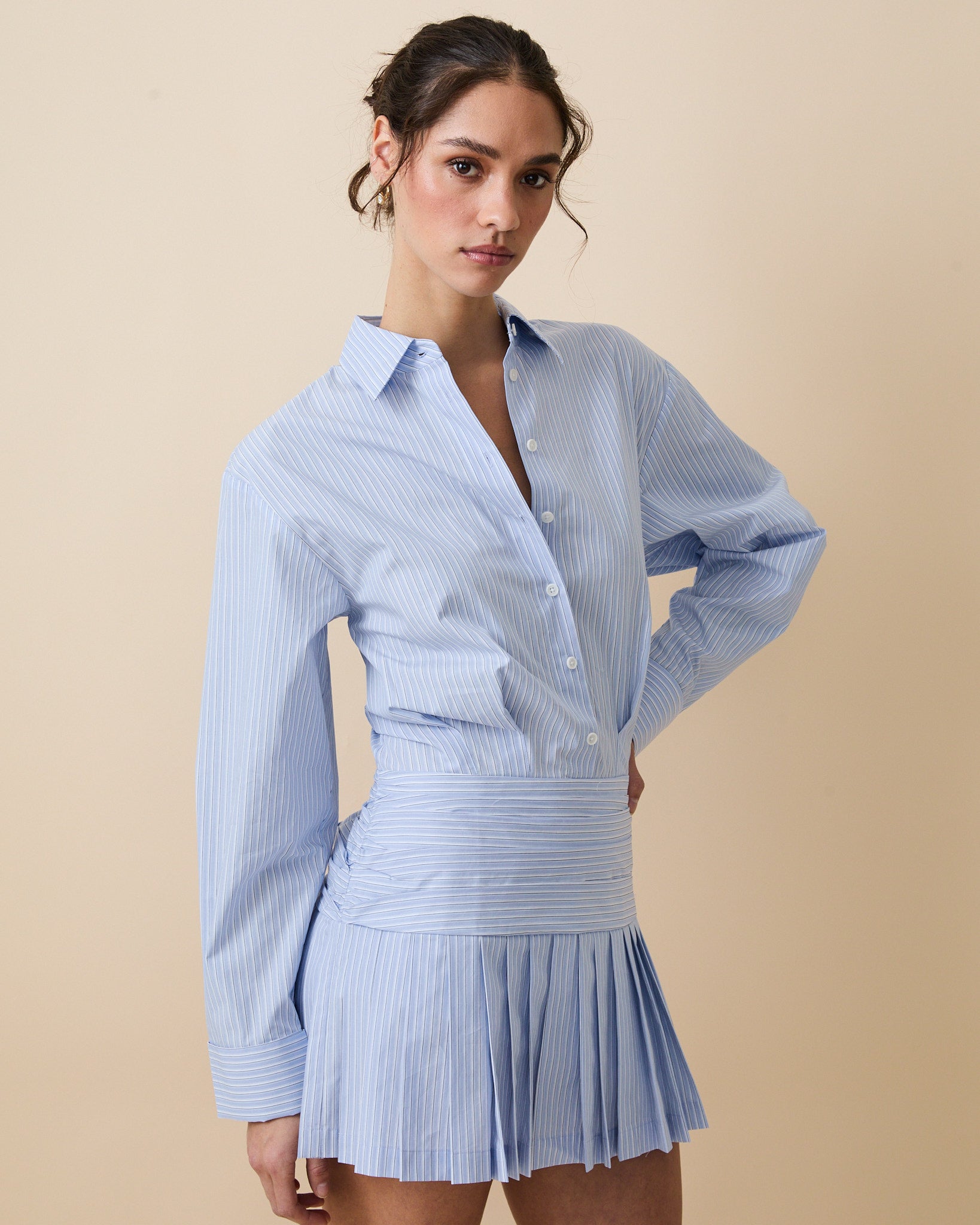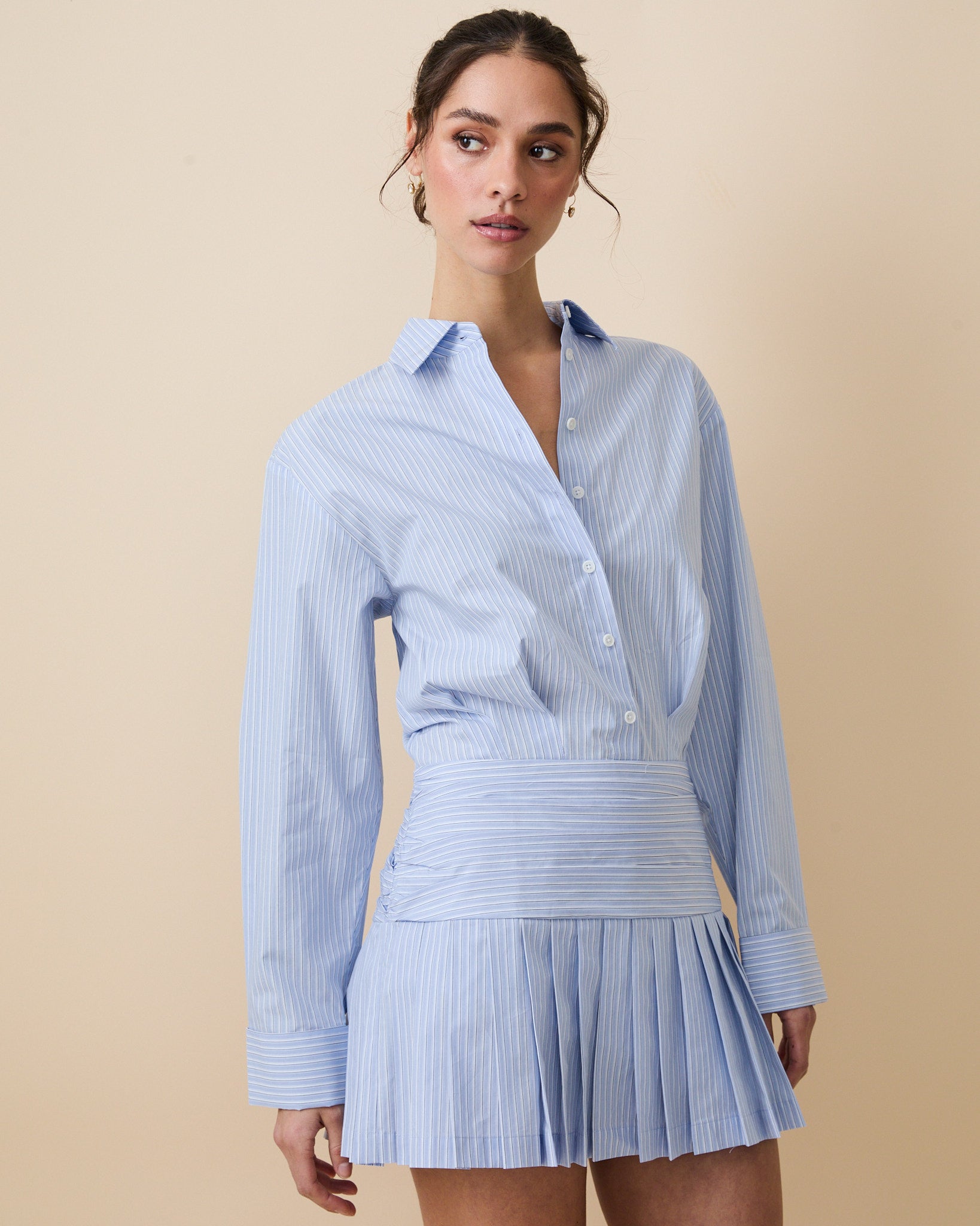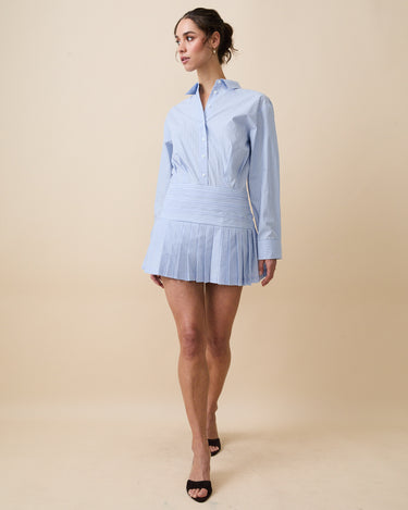 - Flows into a pleated mini skirt for movement
