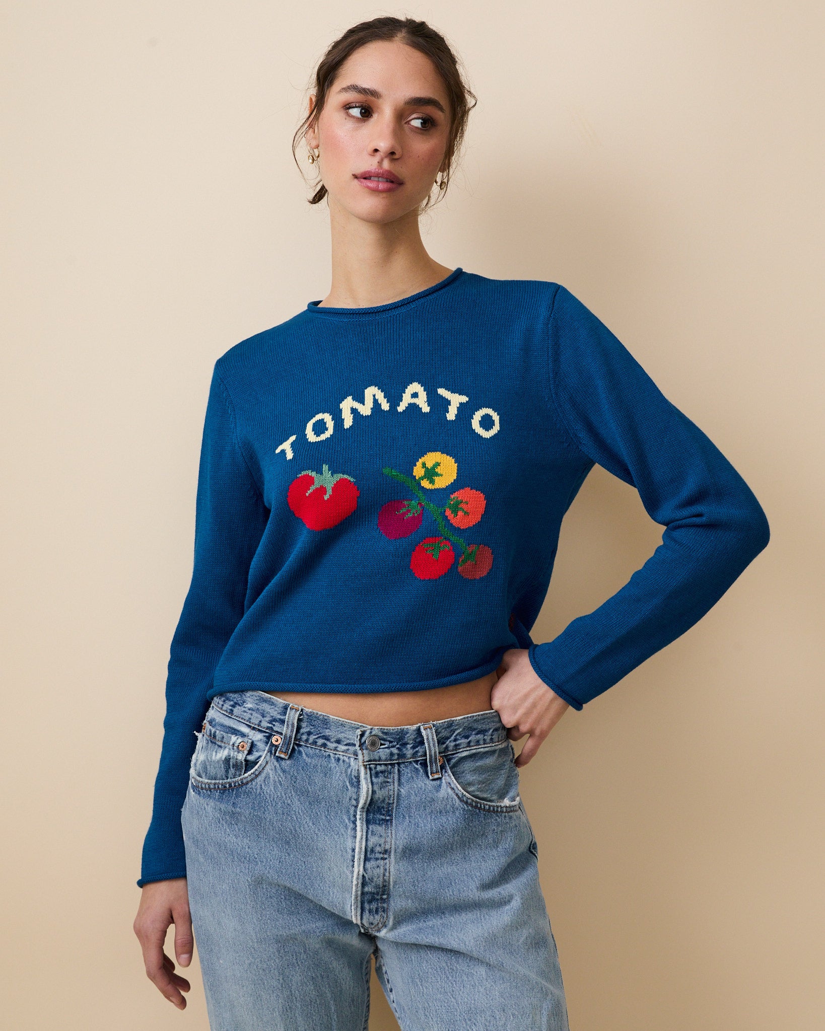 - Bold “TOMATO” motif with tomatoes-on-the-vine detailing