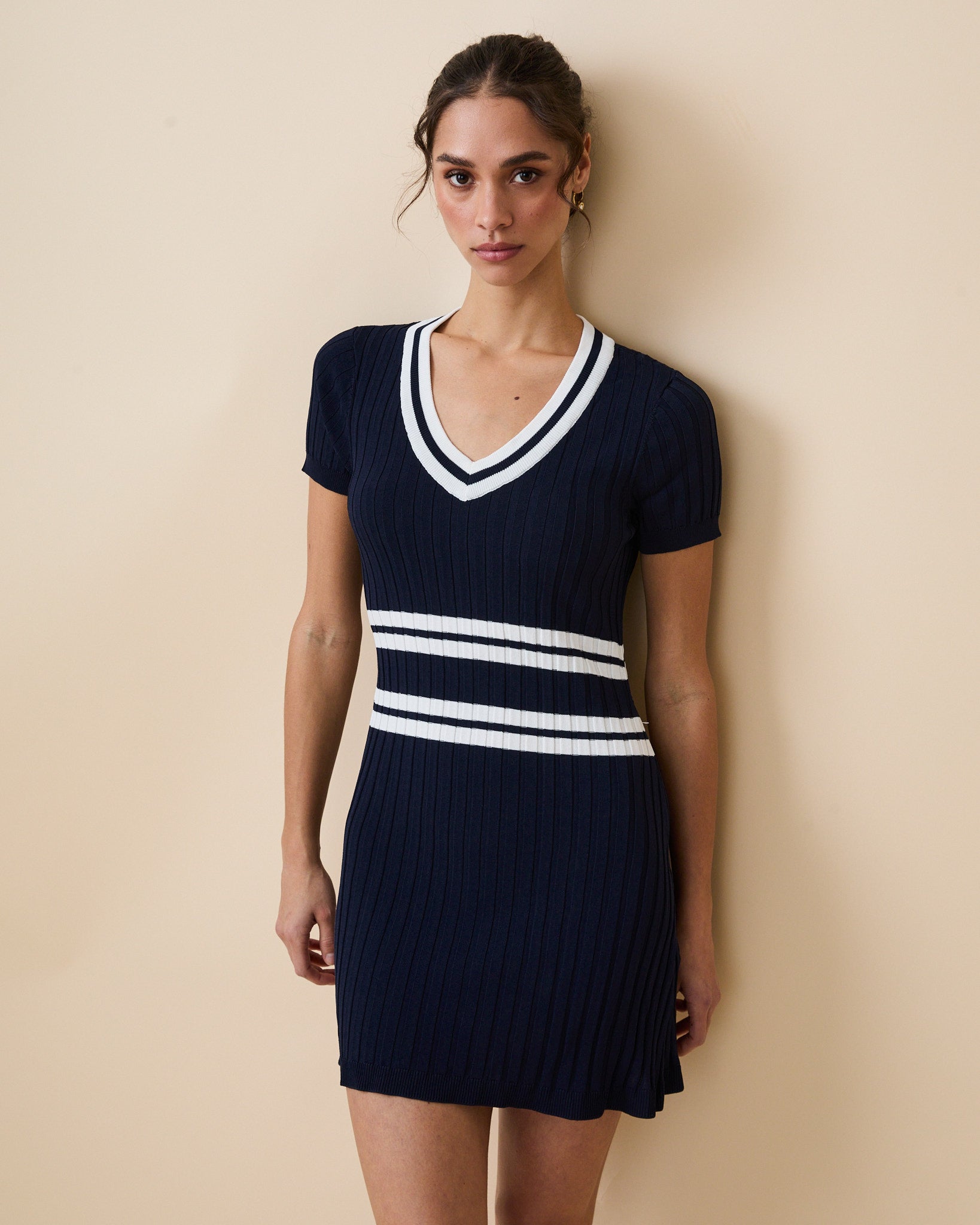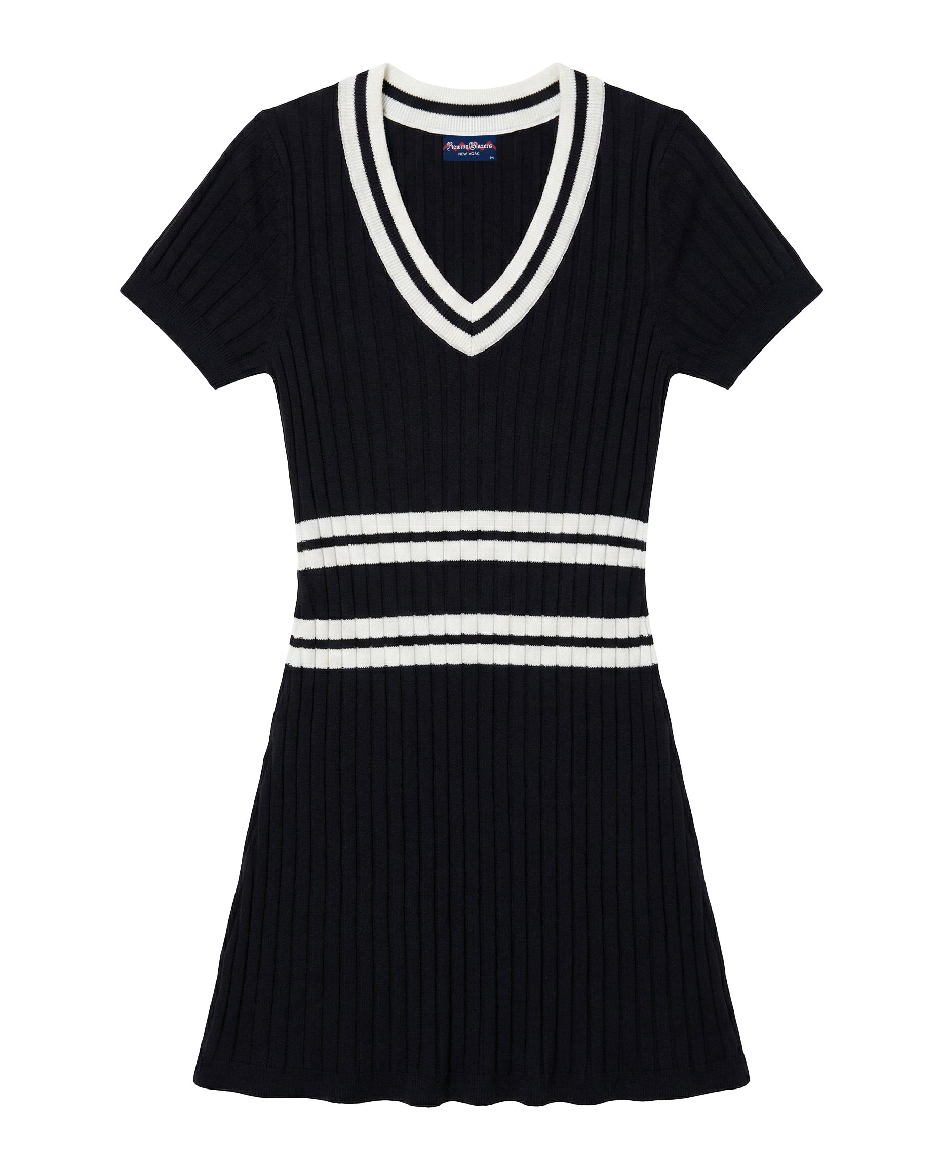 • Women’s fitted V-neck sweater dress with pleated skirt
