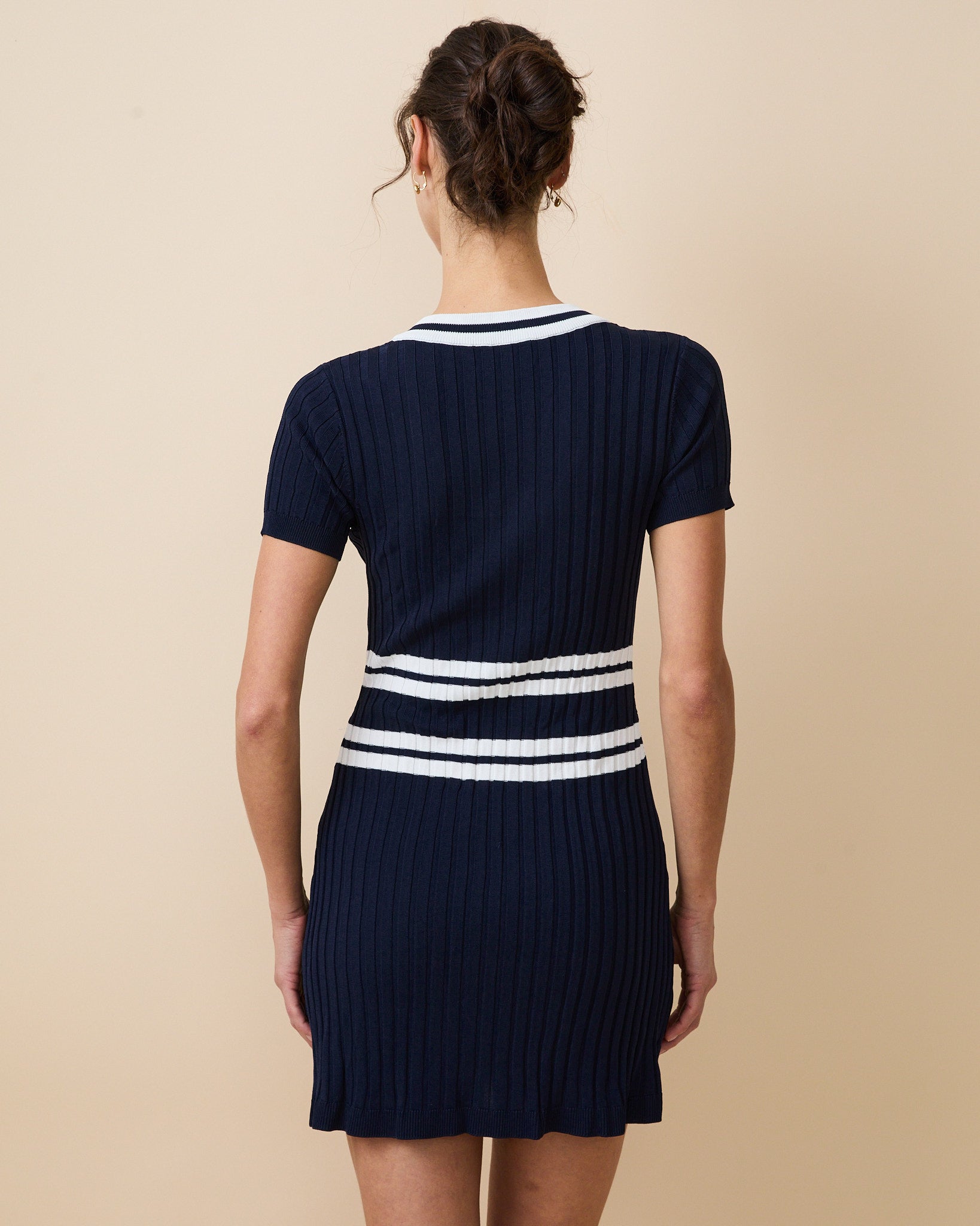 • Matching color detail along the V-neck