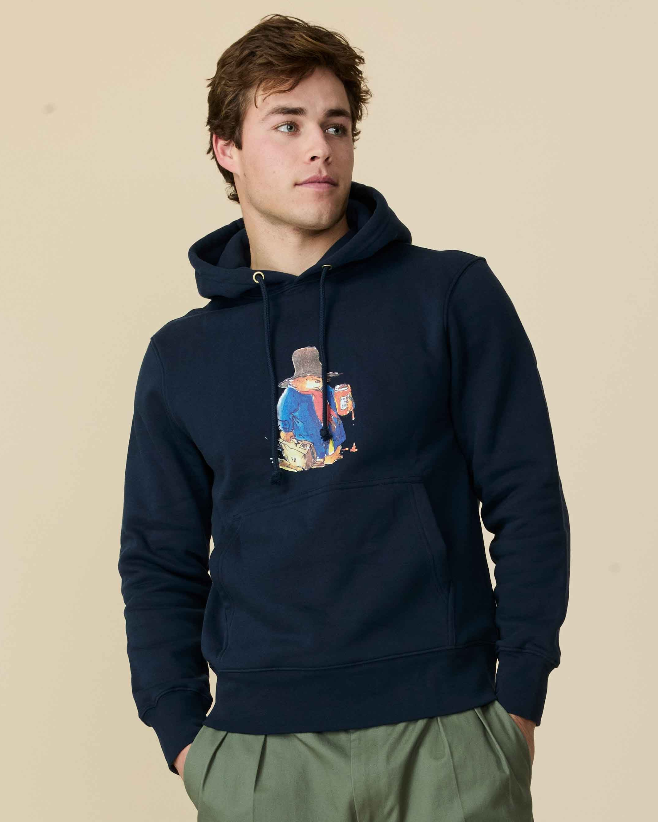 - Men’s organic cotton hooded sweatshirt featuring an oversized Paddington motif on the chest