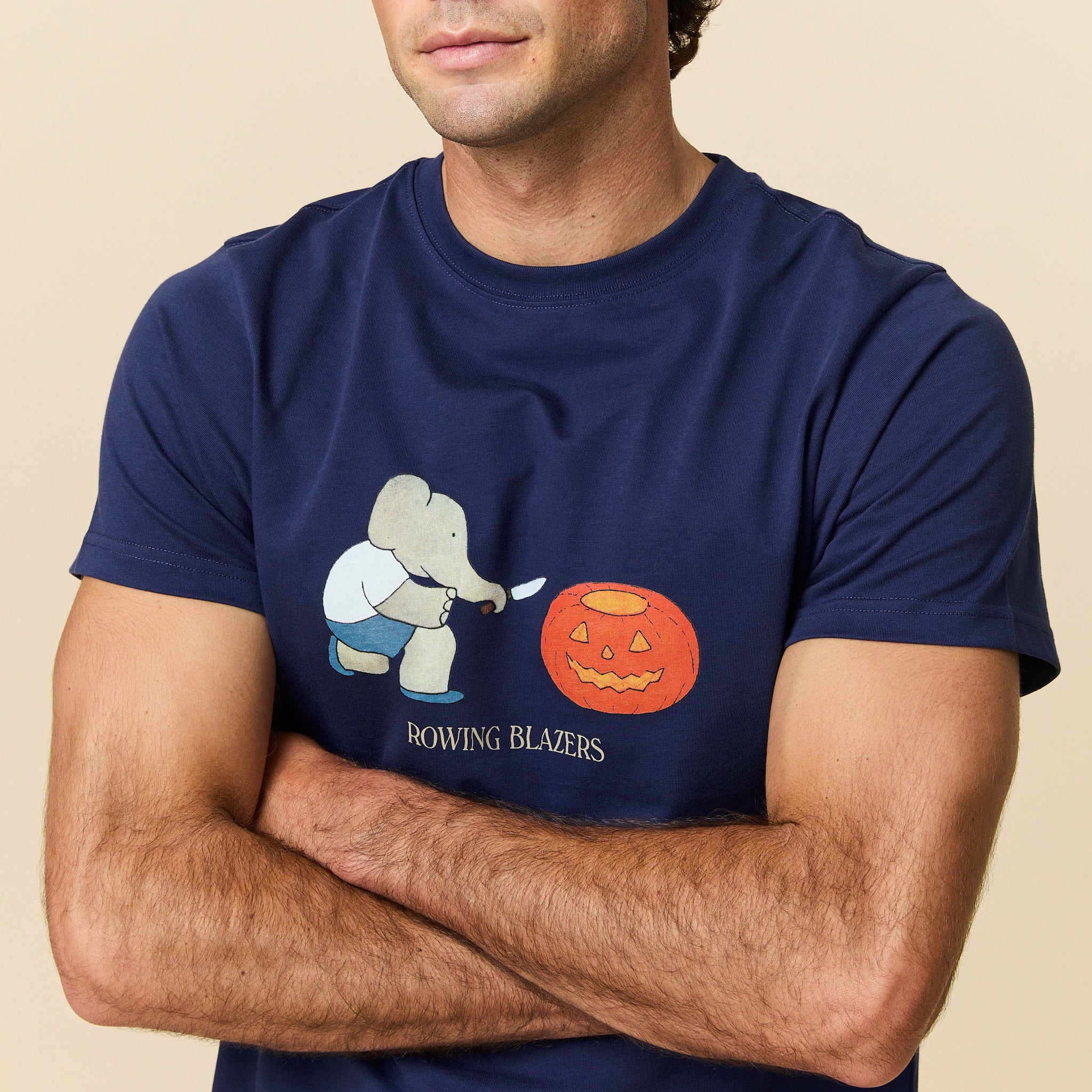 - Men’s organic cotton crewneck t-shirt featuring a pumpkin-carving Babar on the chest
