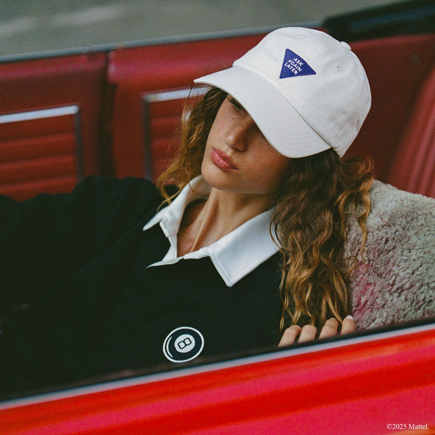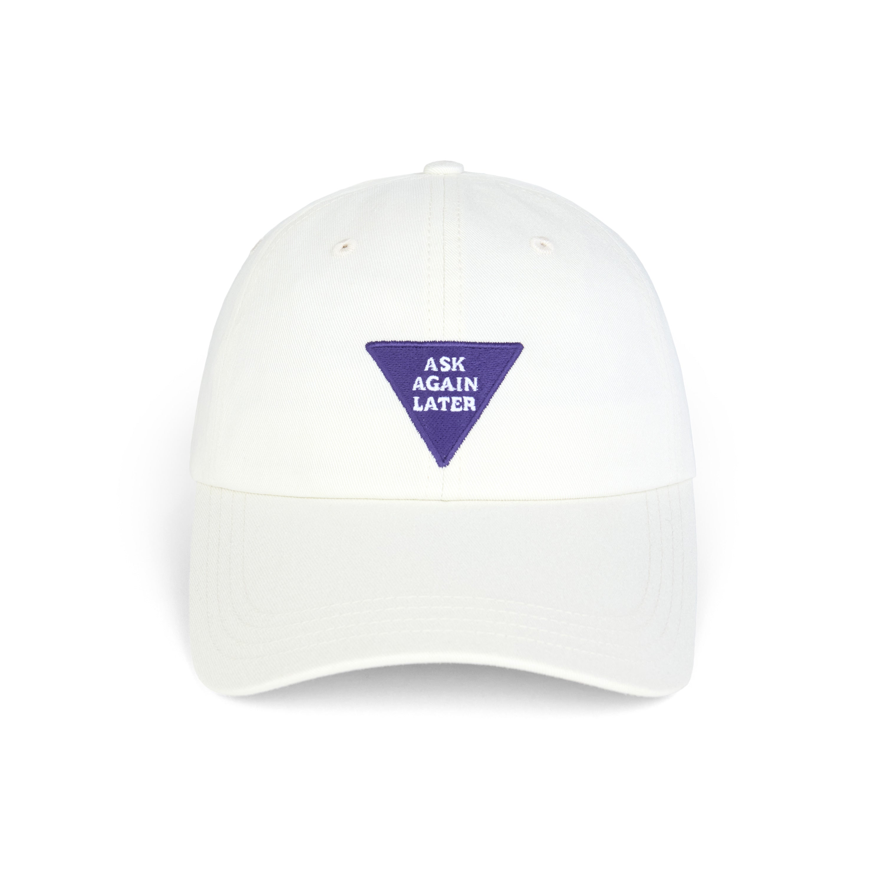 - Low-profile cotton twill dad hat with an embroidered Magic 8 Ball™ “ASK AGAIN LATER” motif on the crown