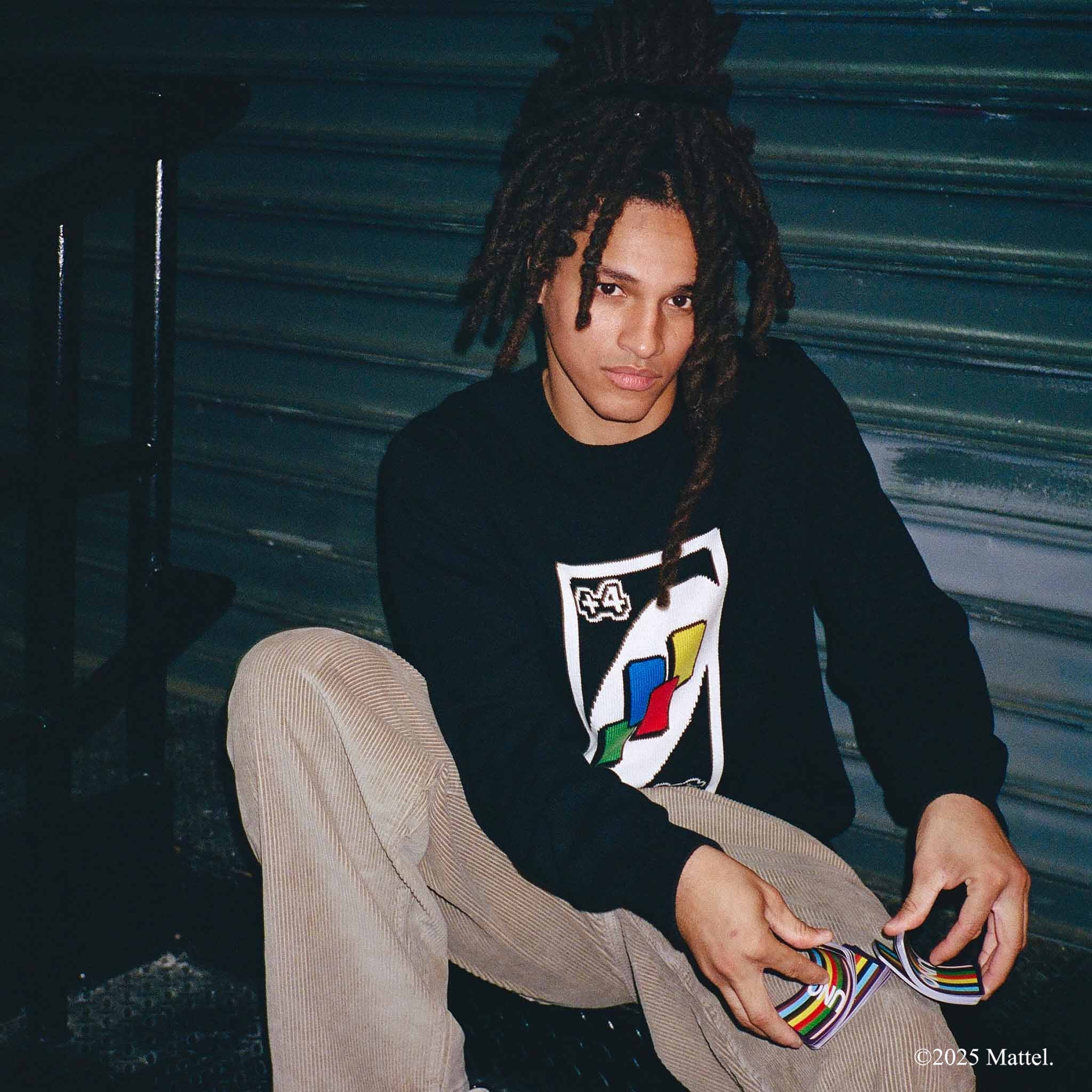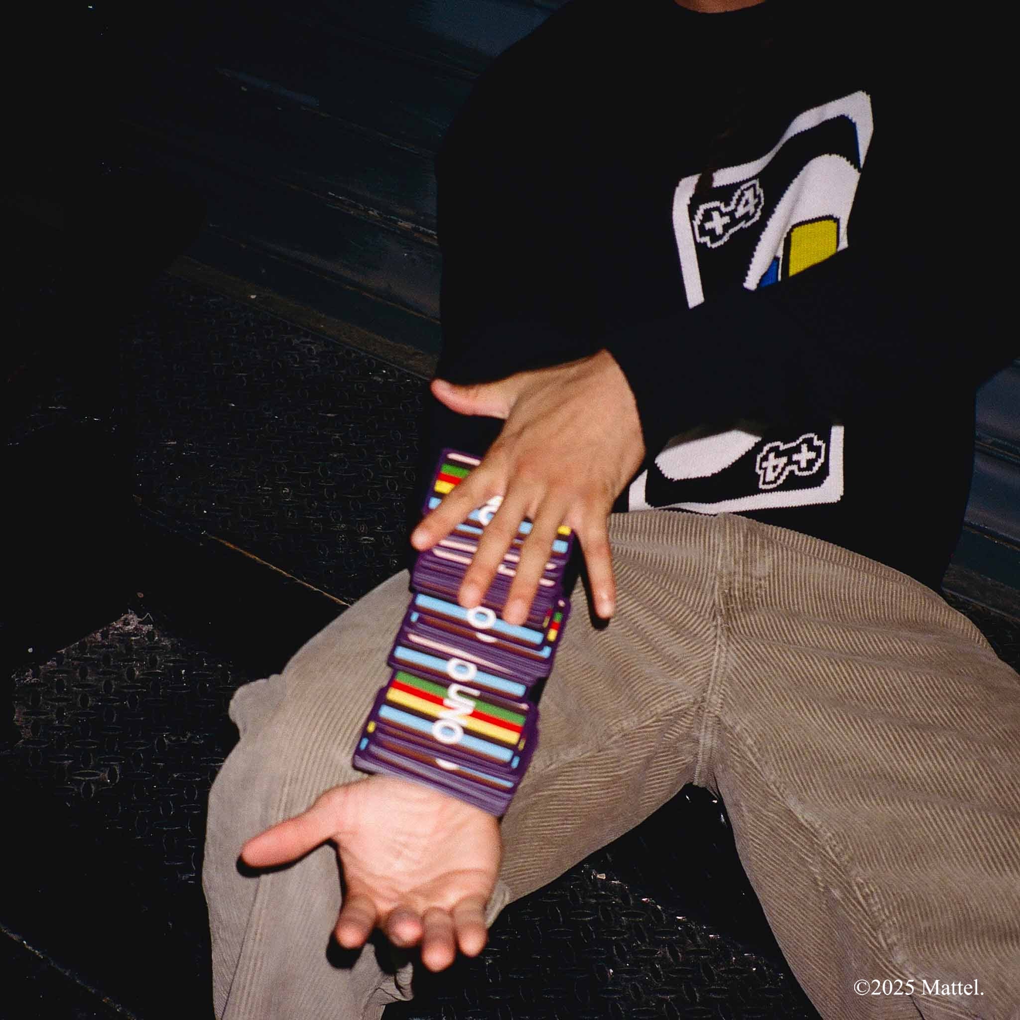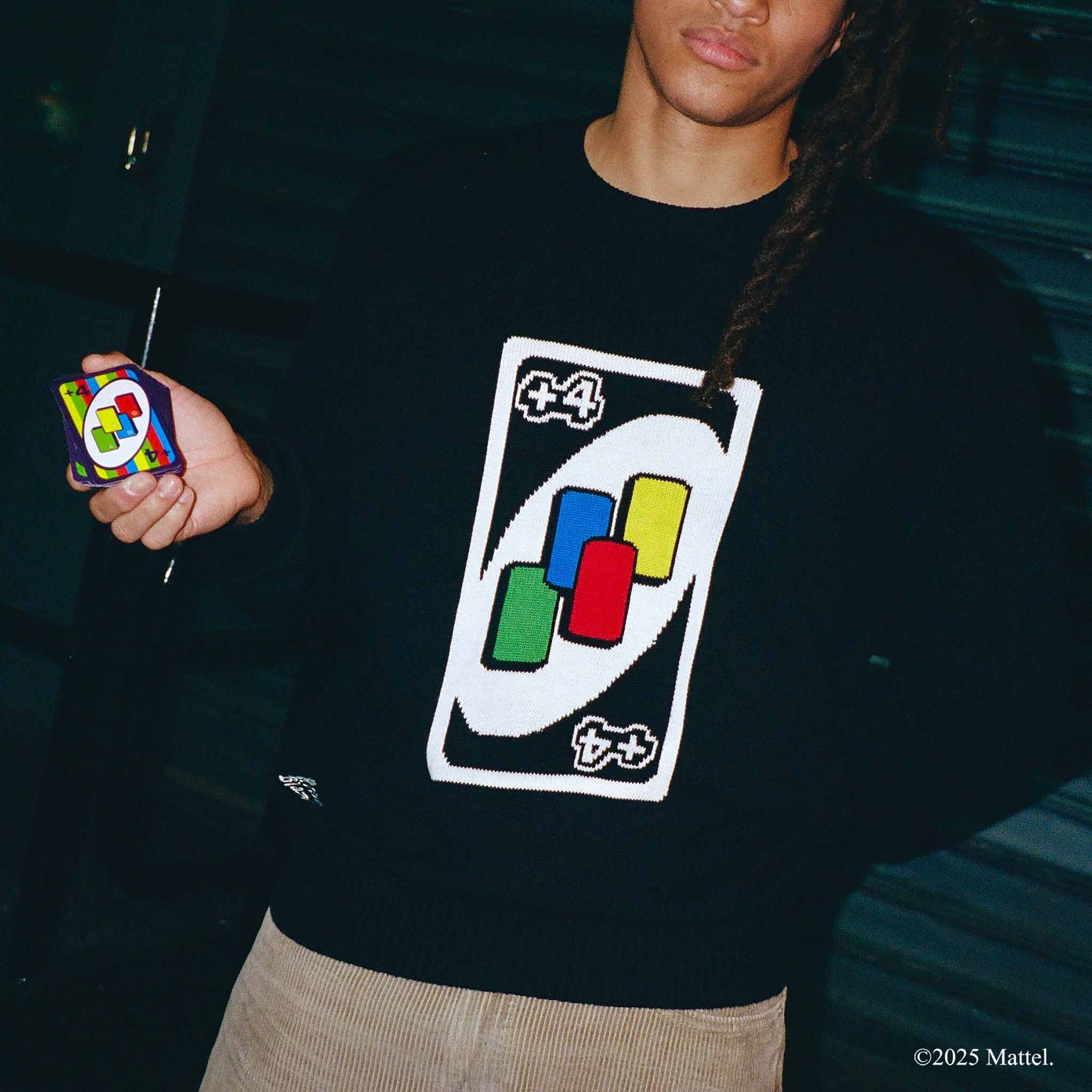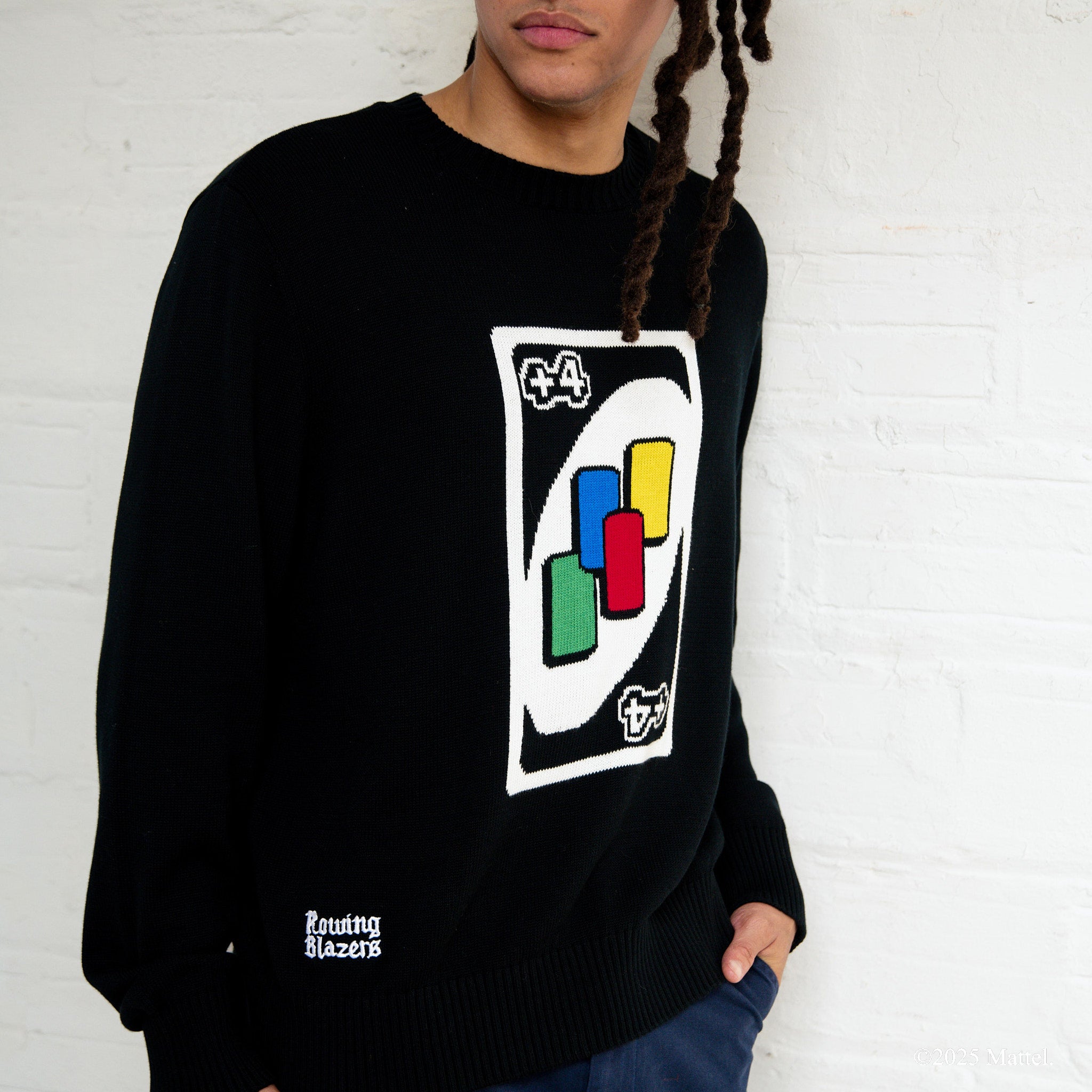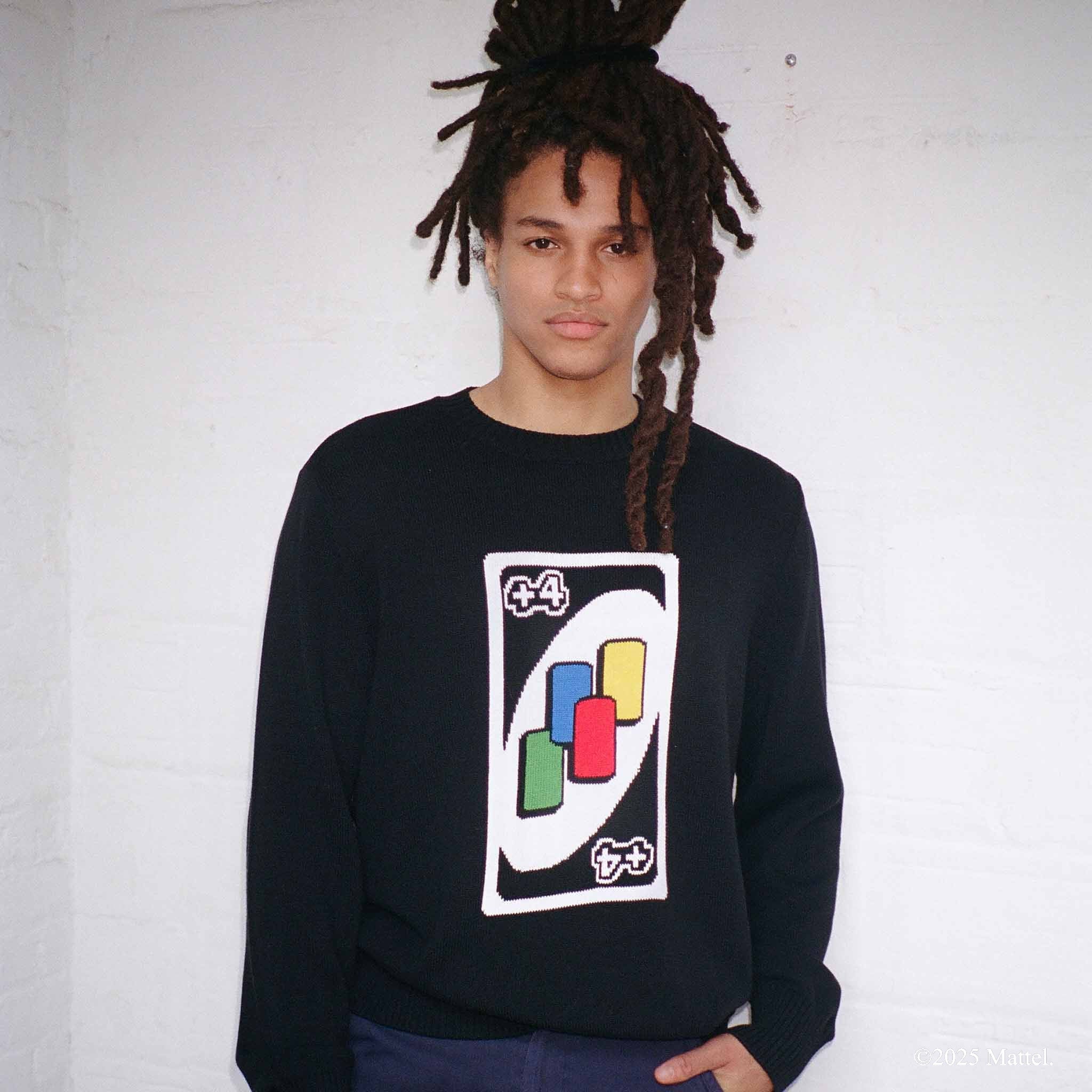- Men’s cotton crewneck sweater with an intarsia-knit UNO™ Draw Four Card motif on the chest Ribbed collar, cuffs and hem.
