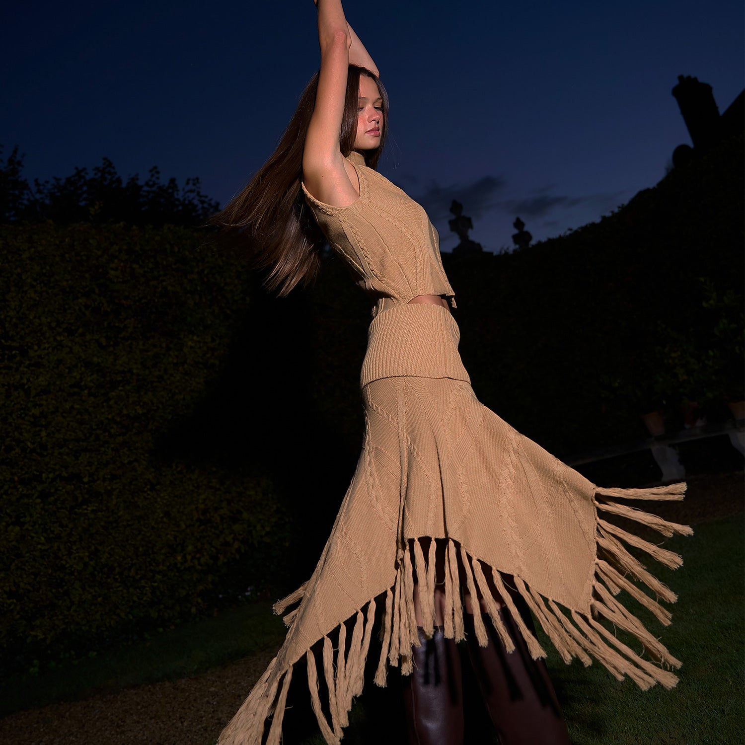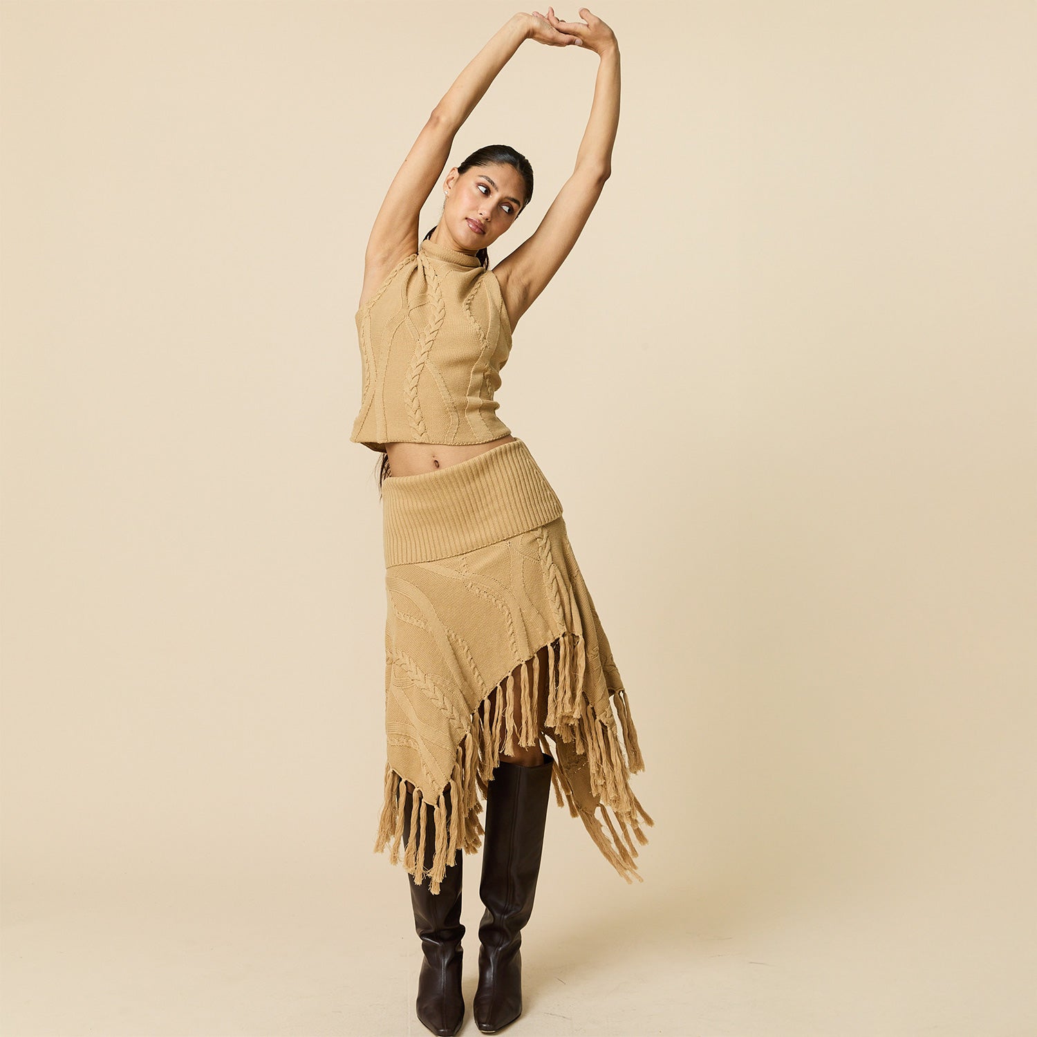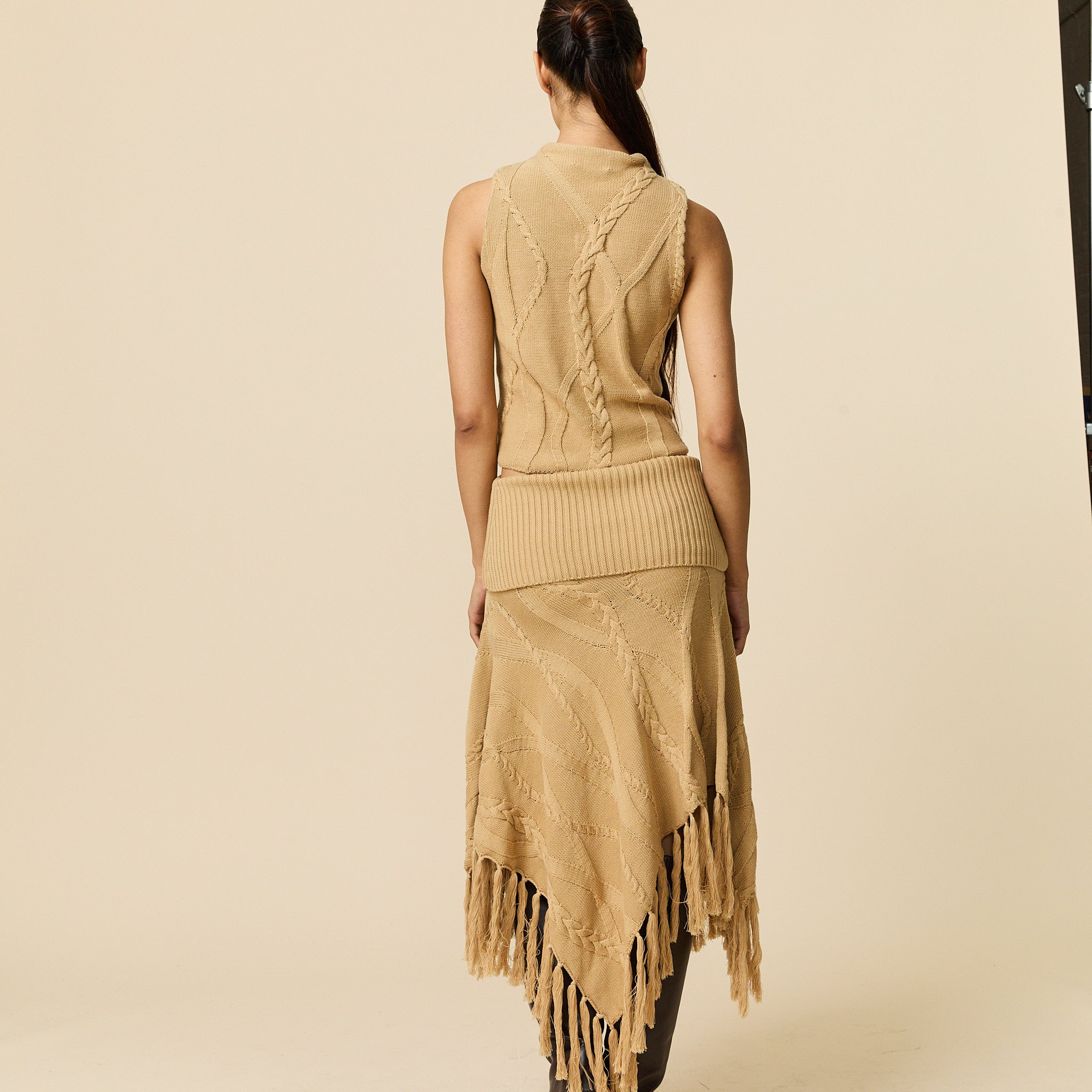 • Women’s fringed cable-knit skirt with a dramatic, asymmetrical hem Fringed.