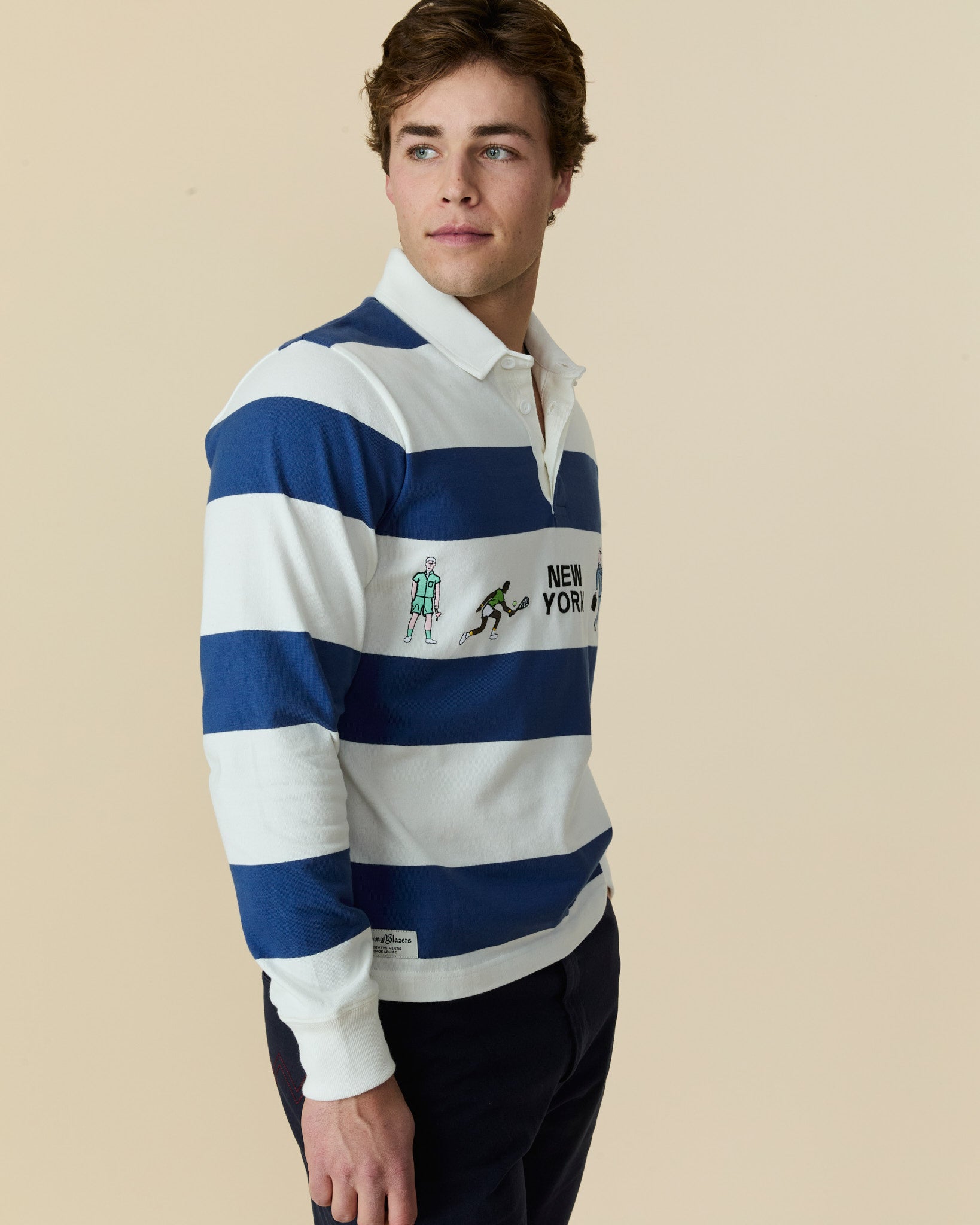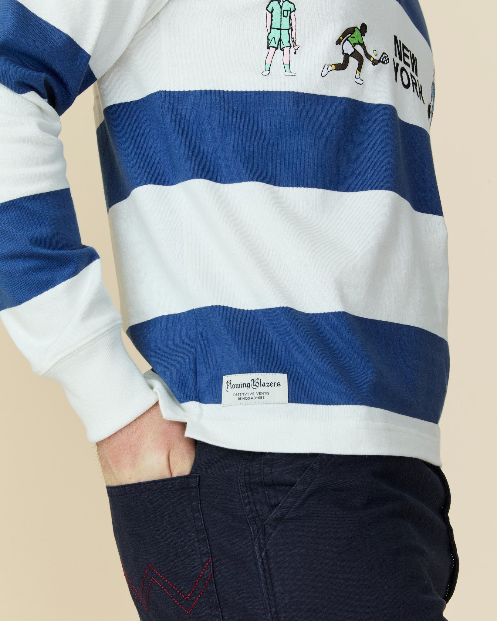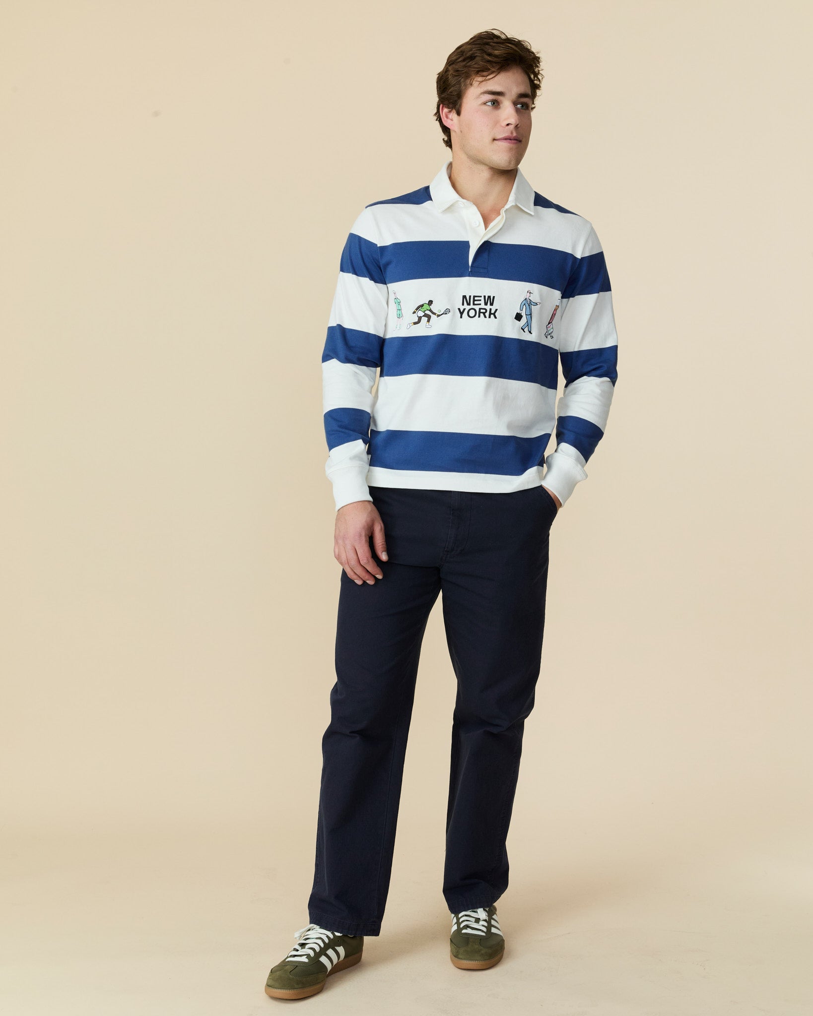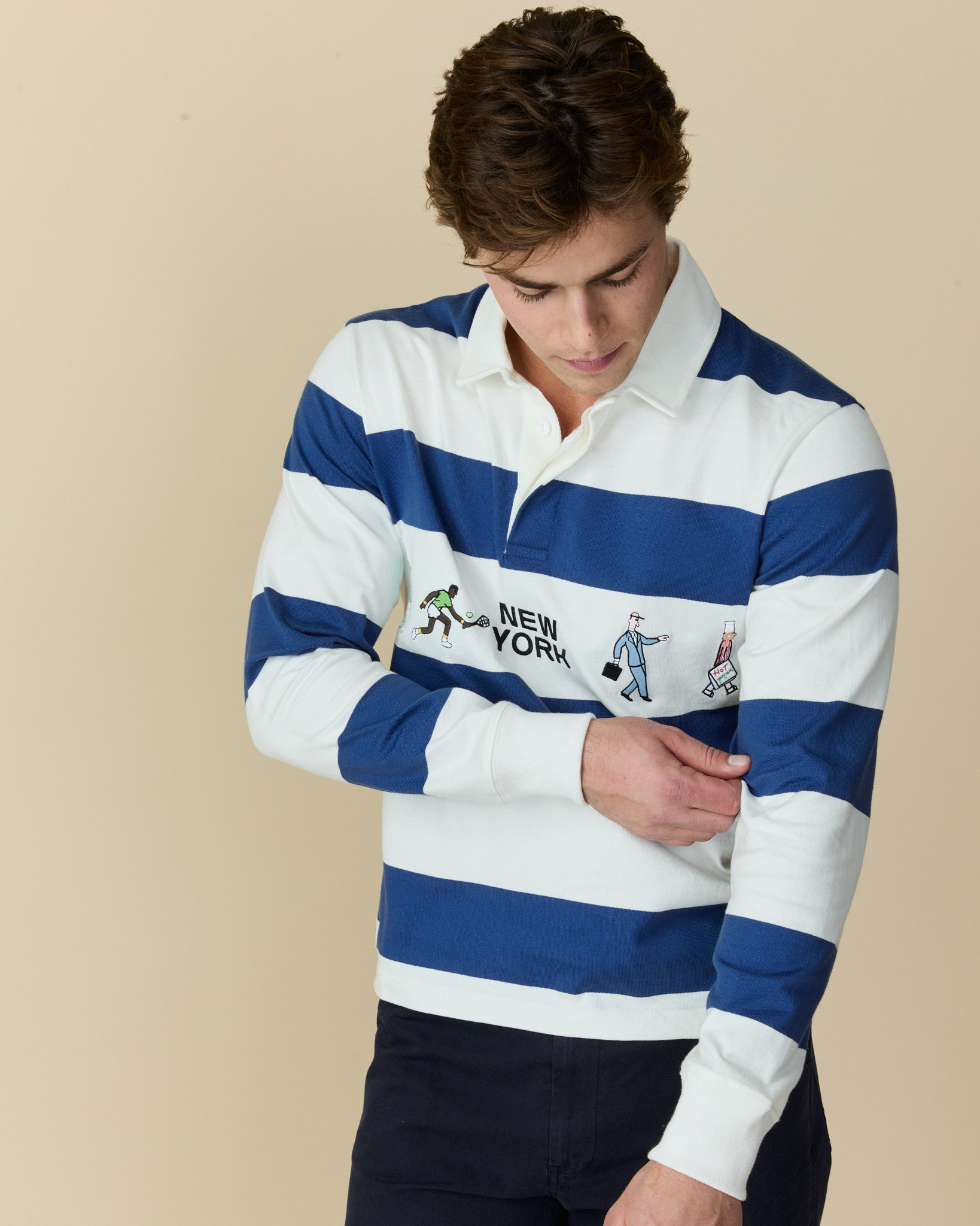 - Lightweight (285GSM) organic cotton striped rugby shirt with an embroidered NYC motif across the chest