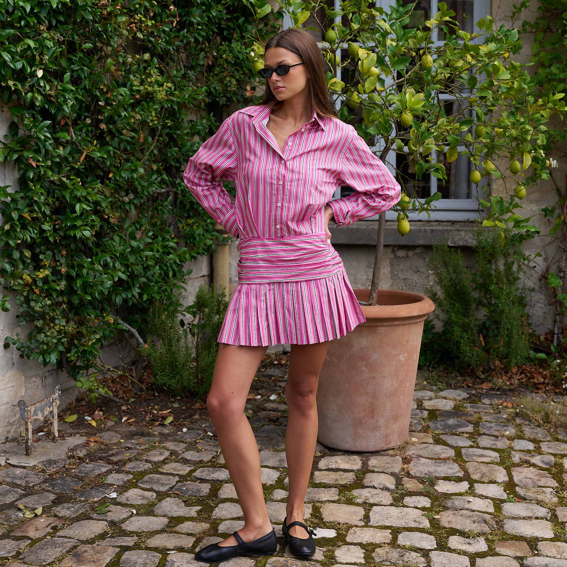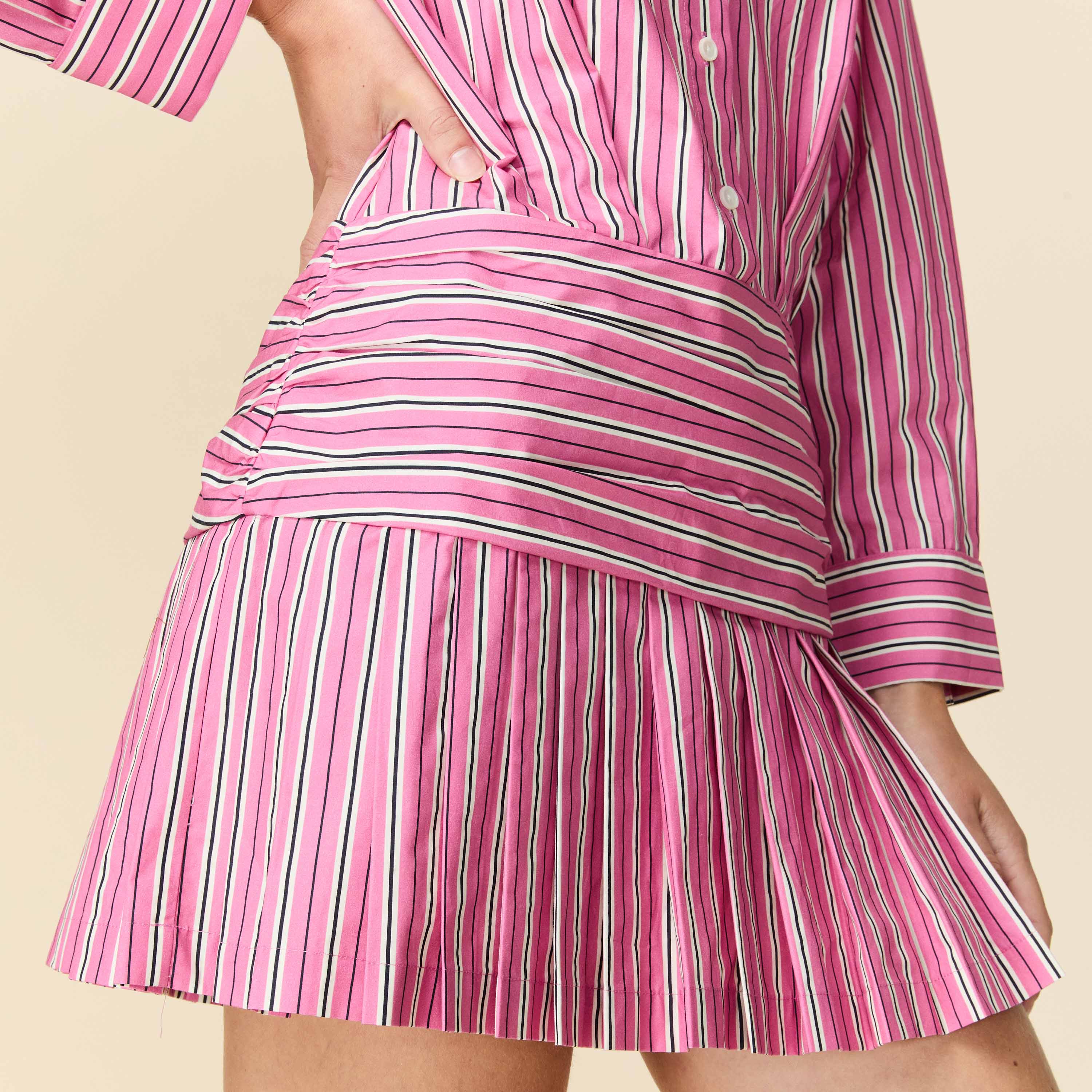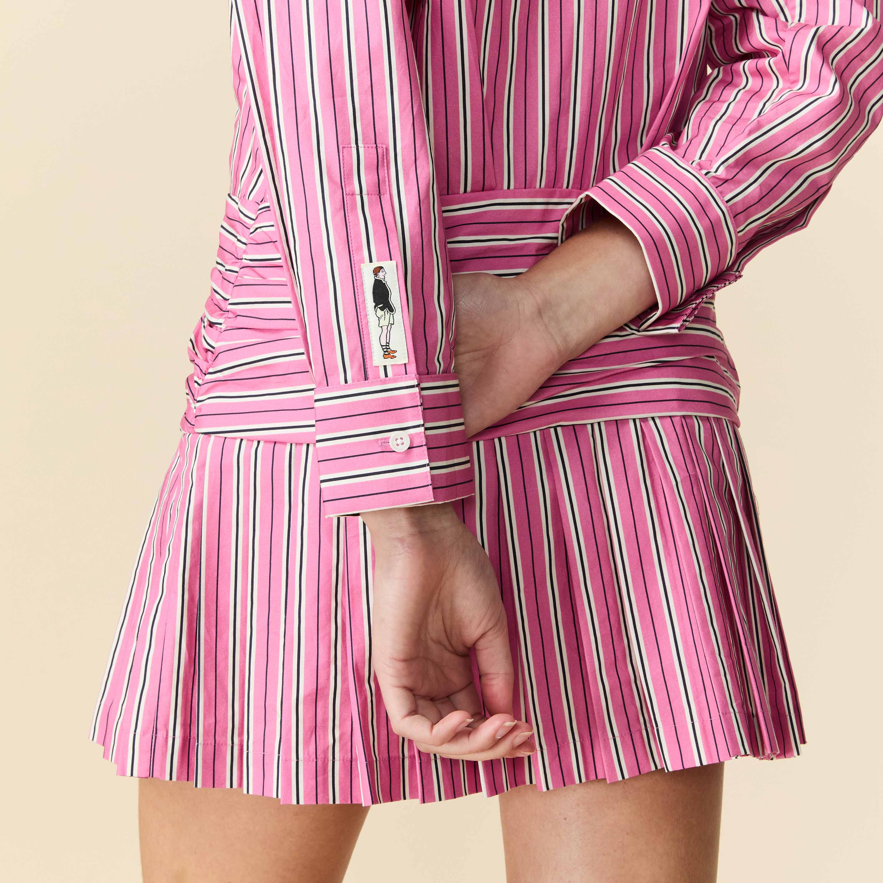 Women's Button Down Pleated Shirt Dress Euro Pink Stripe