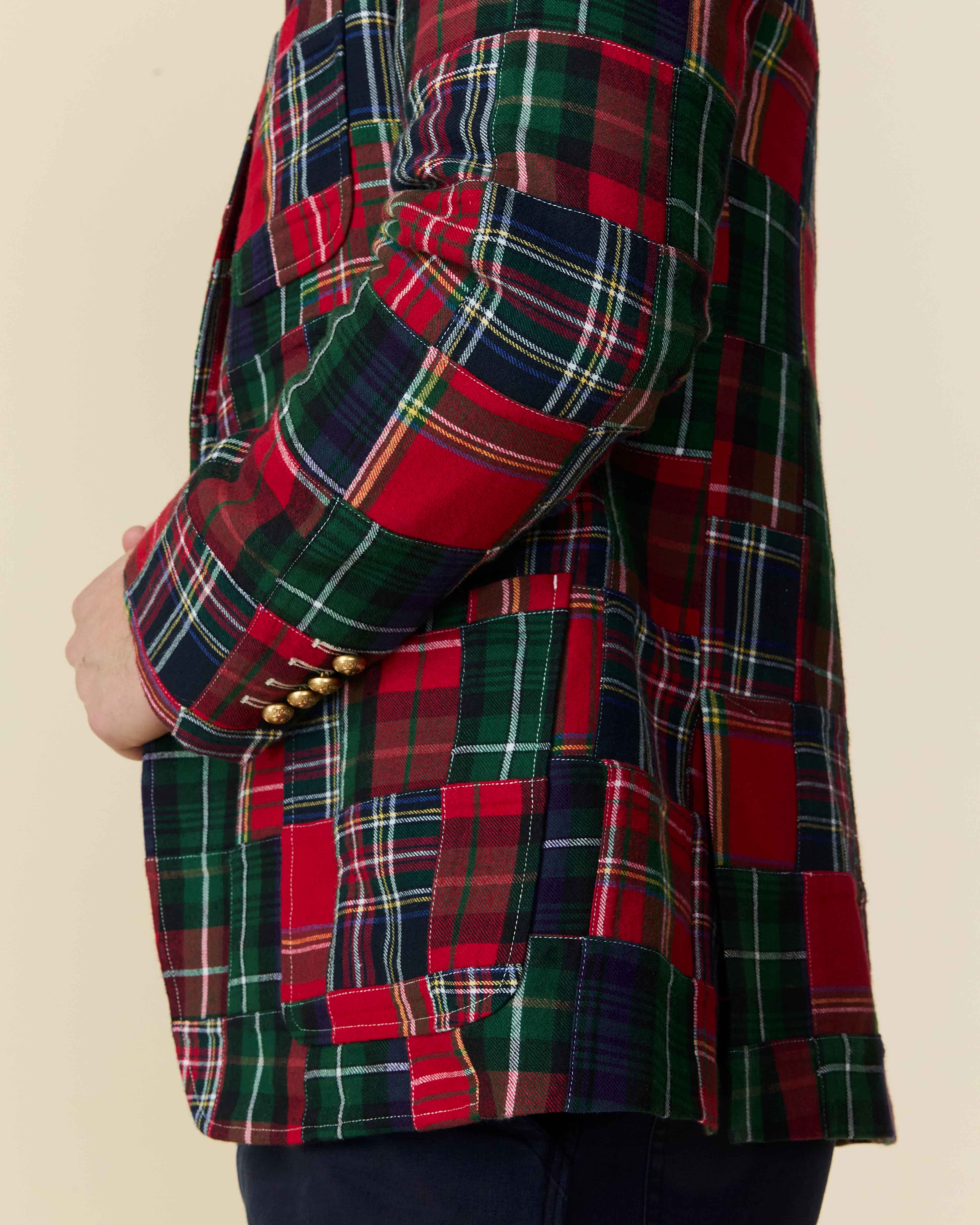 • Men’s cotton twill patchwork blazer in mixed holiday tartans 3-roll-2 silhouette. 3 front patch pockets. 1/4” topstitch swelled-seam finishing.