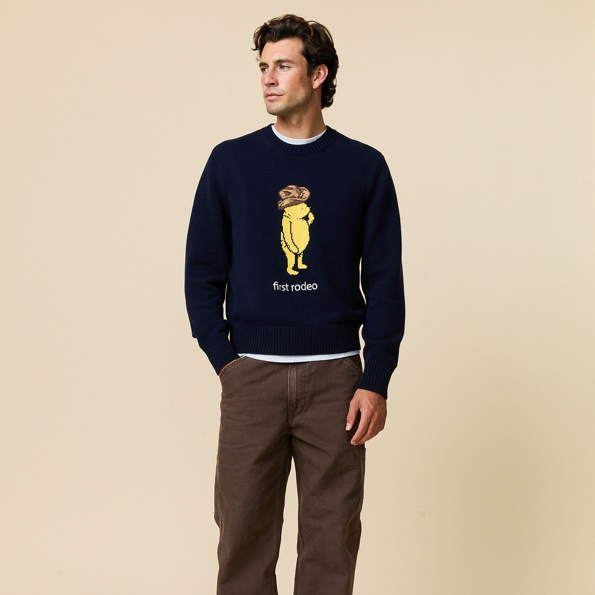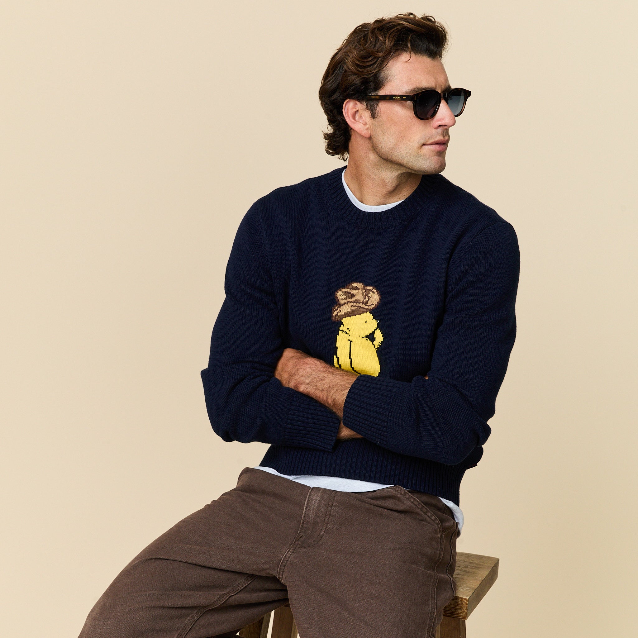• Yee haw! Men’s cotton crewneck sweater with an intarsia-knit Winnie-the-Pooh motif on the chest