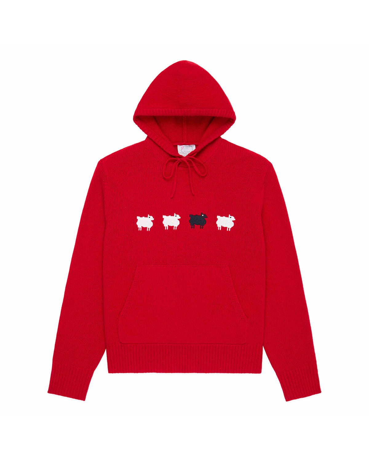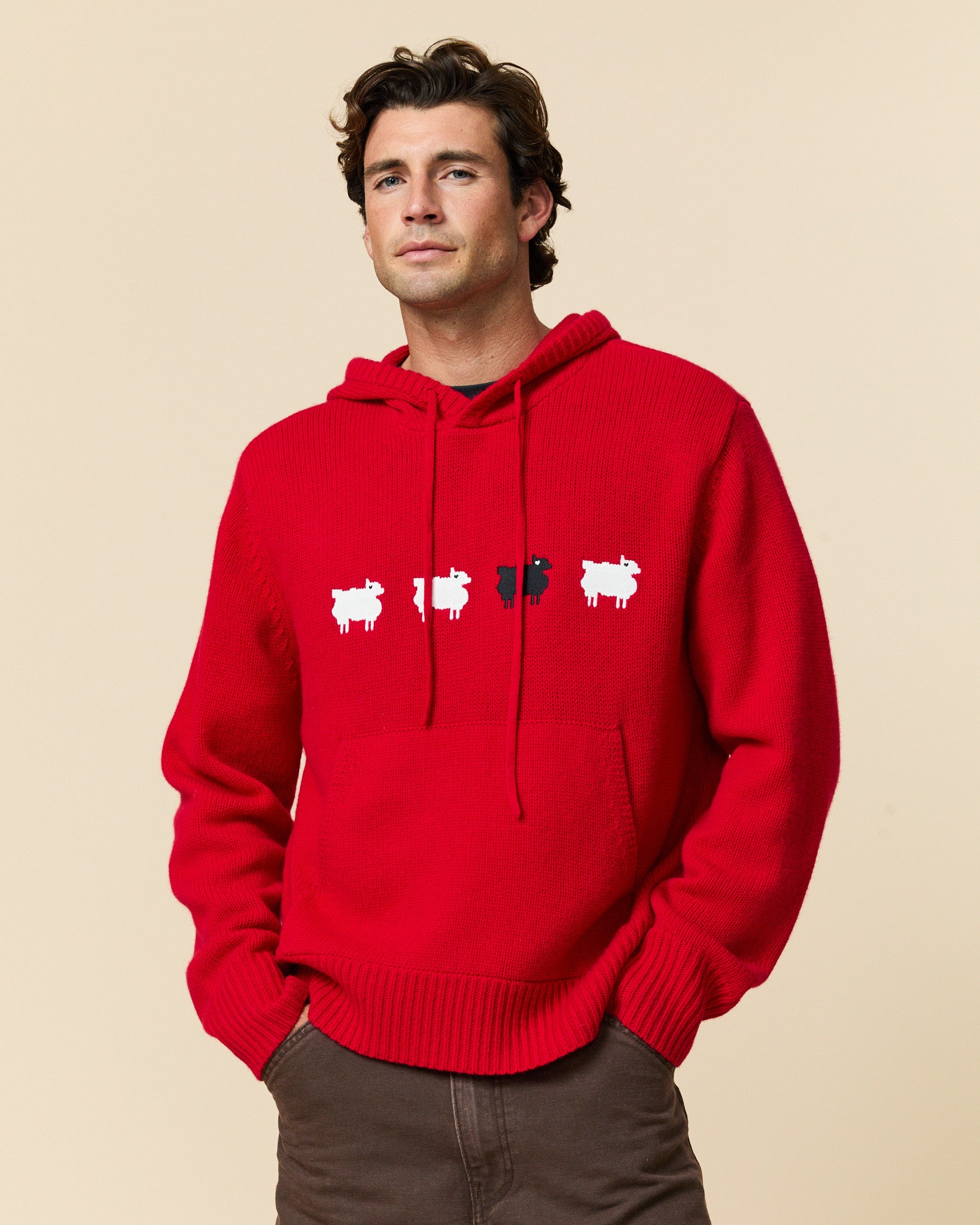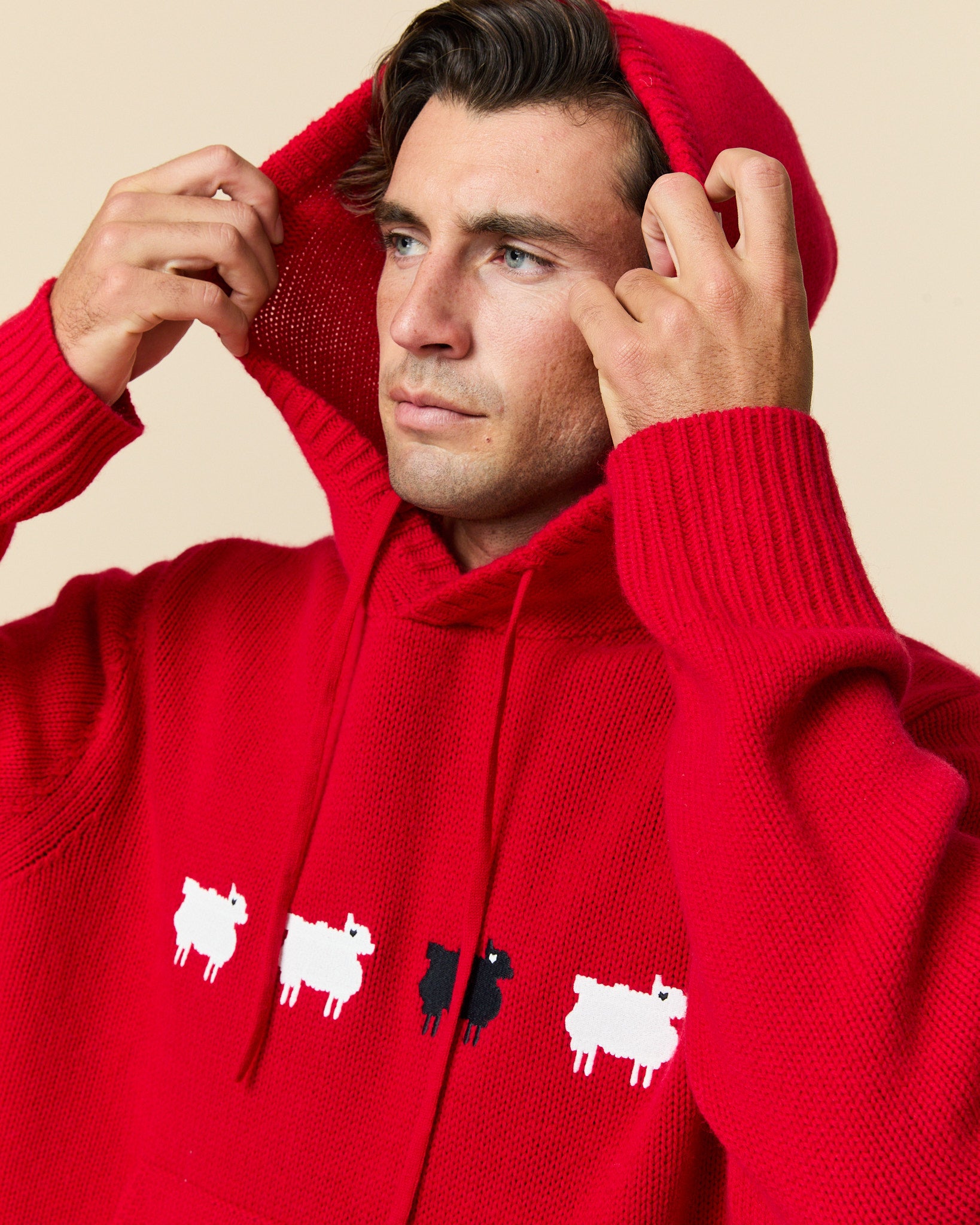 • Men’s wool-and-cashmere blend hooded sweater featuring a blown-up take on Warm & Wonderful’s iconic “Black Sheep” pattern