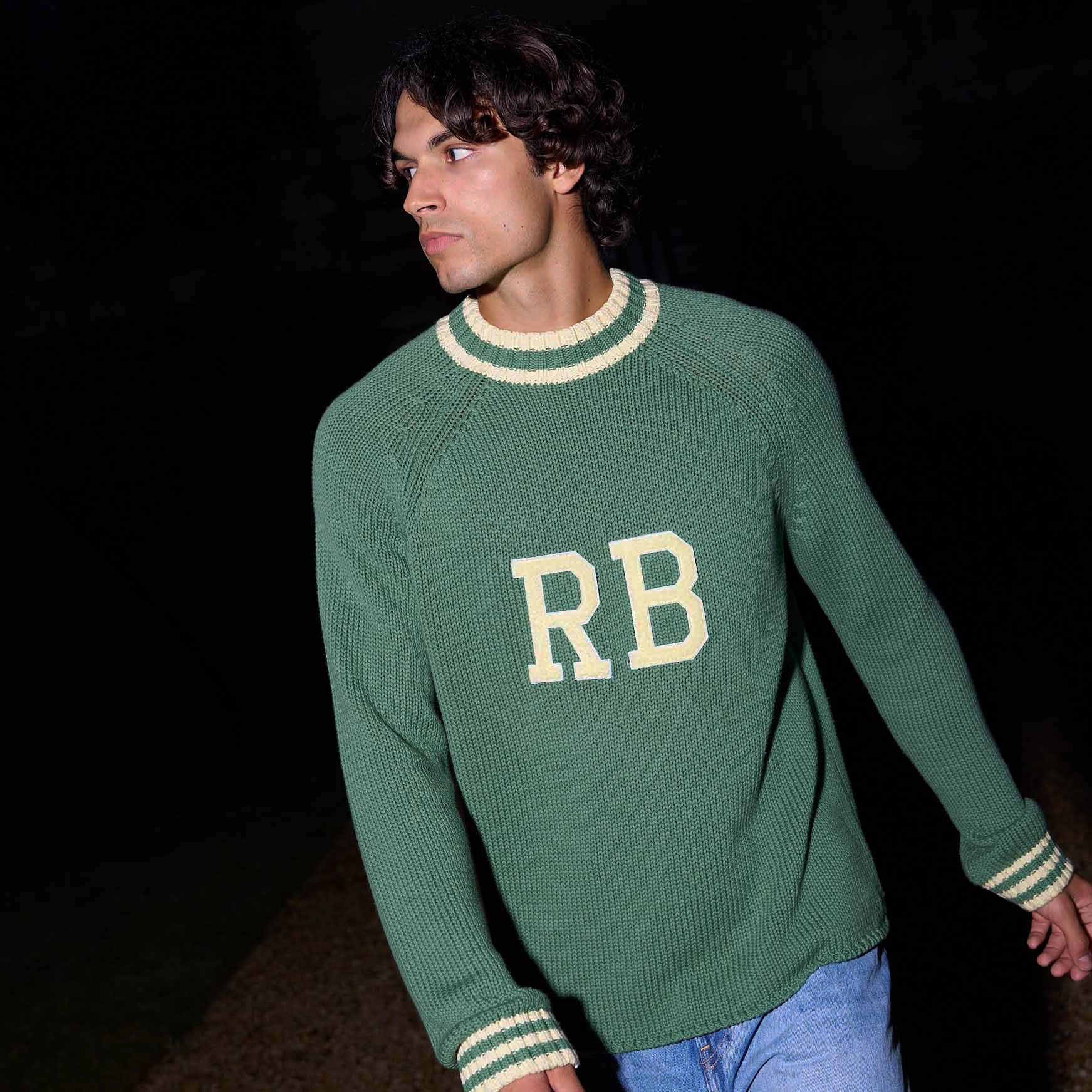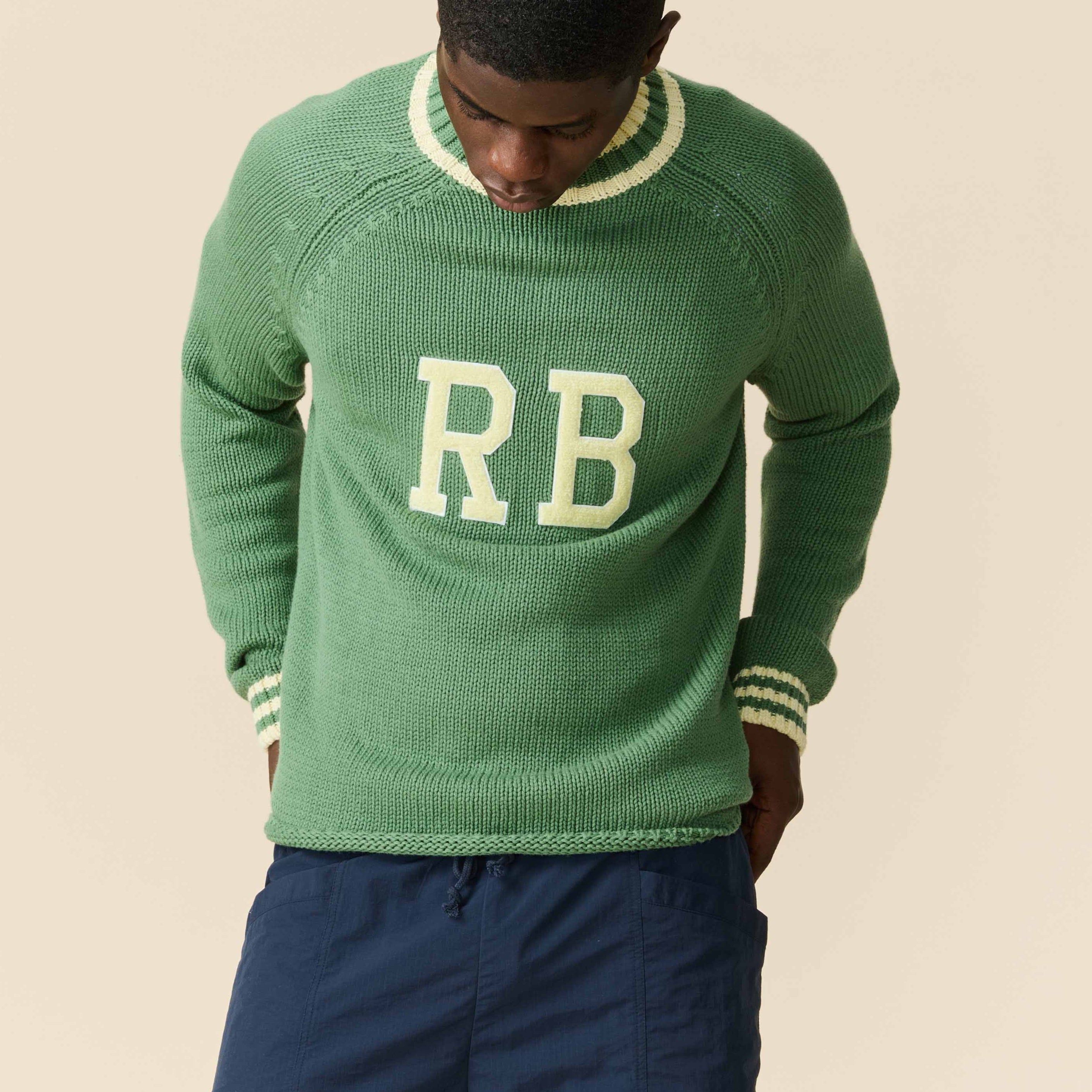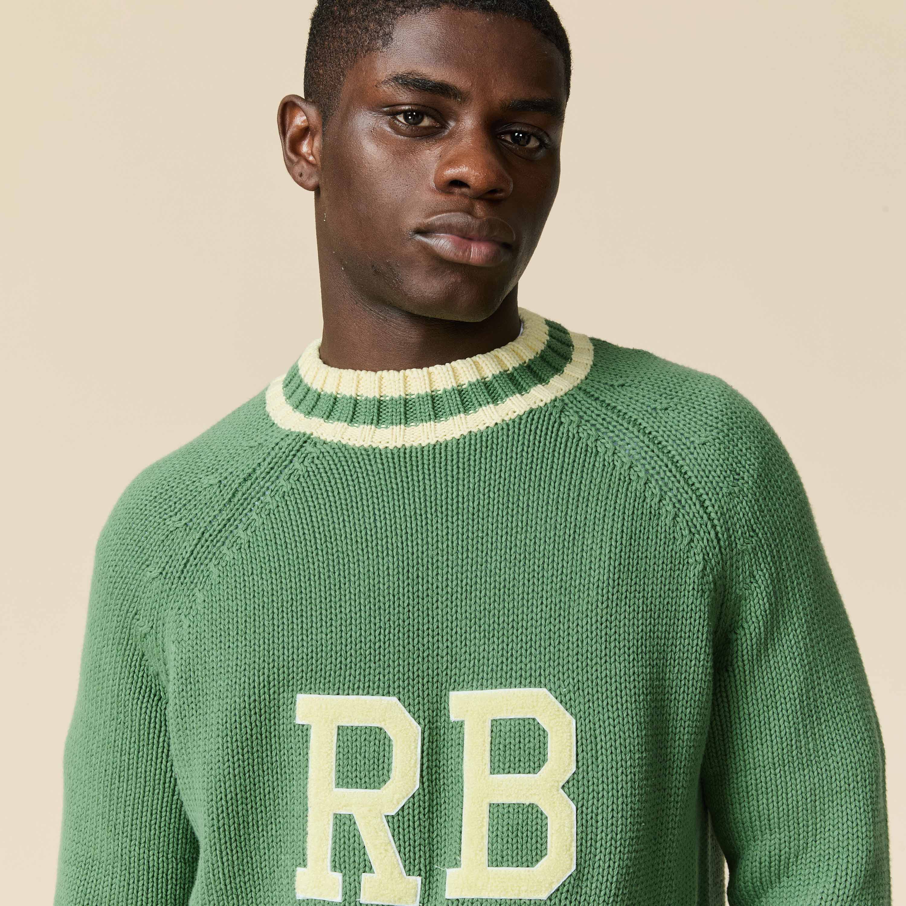 • Men’s collegiate-inspired cotton crewneck sweater with contrasting trim and varsity letter-style chenille patches
