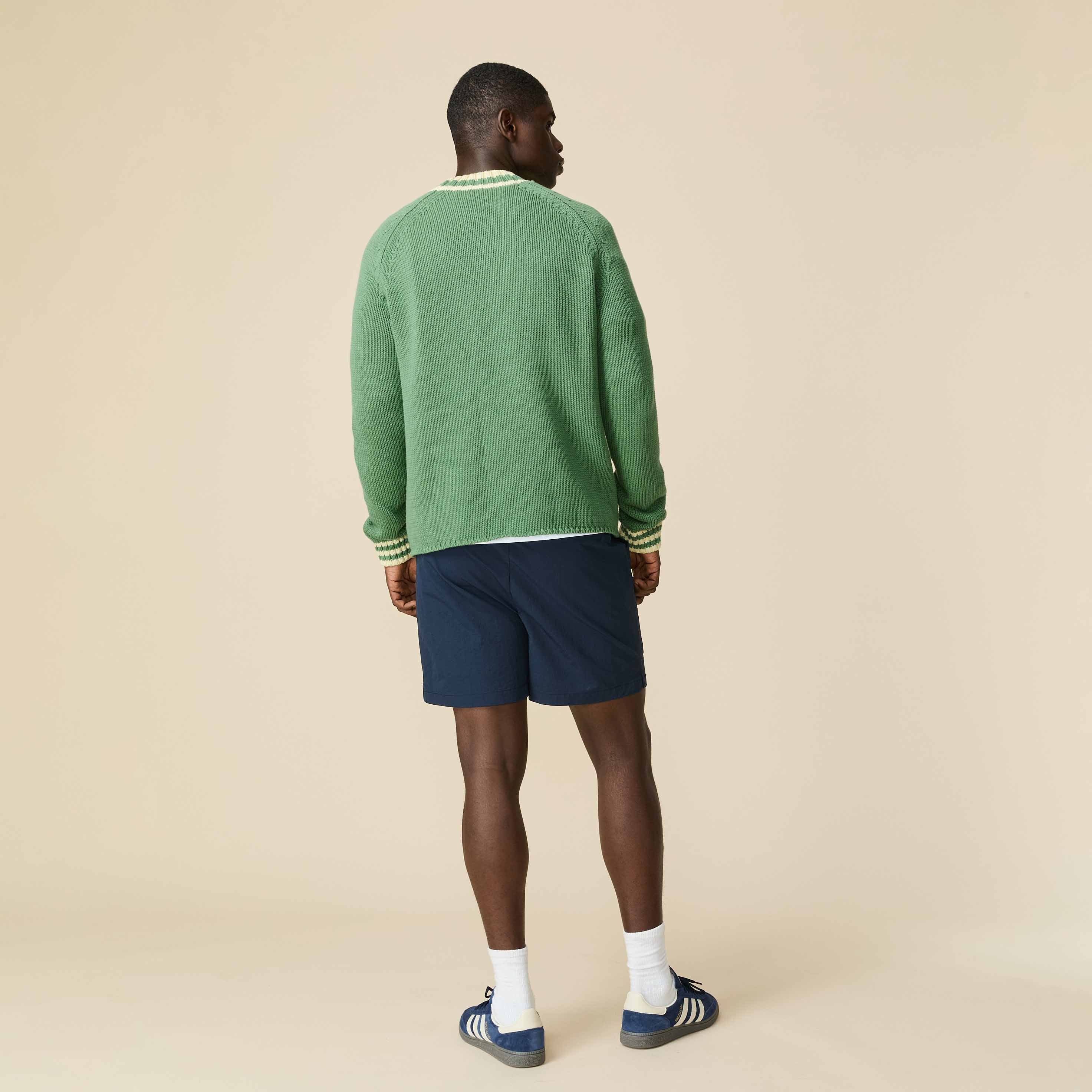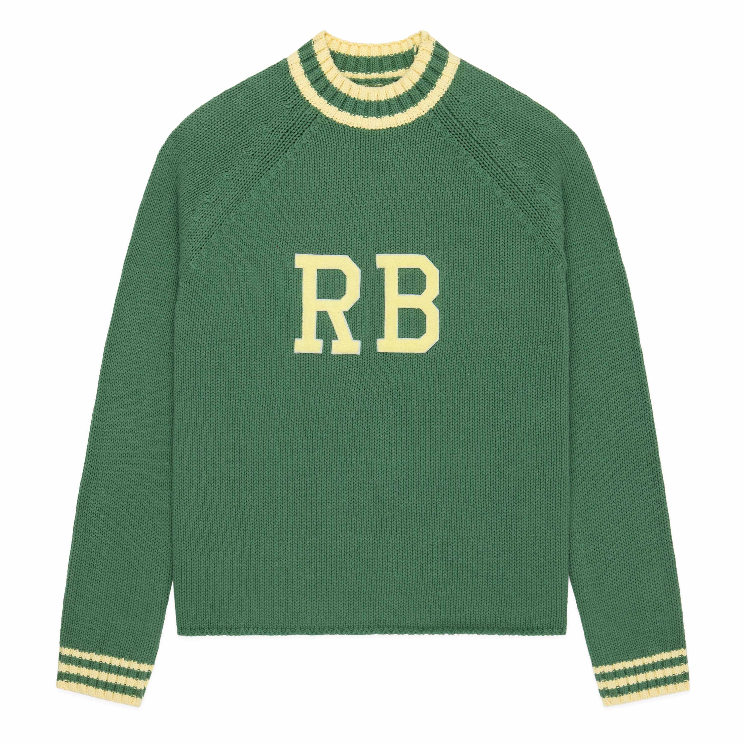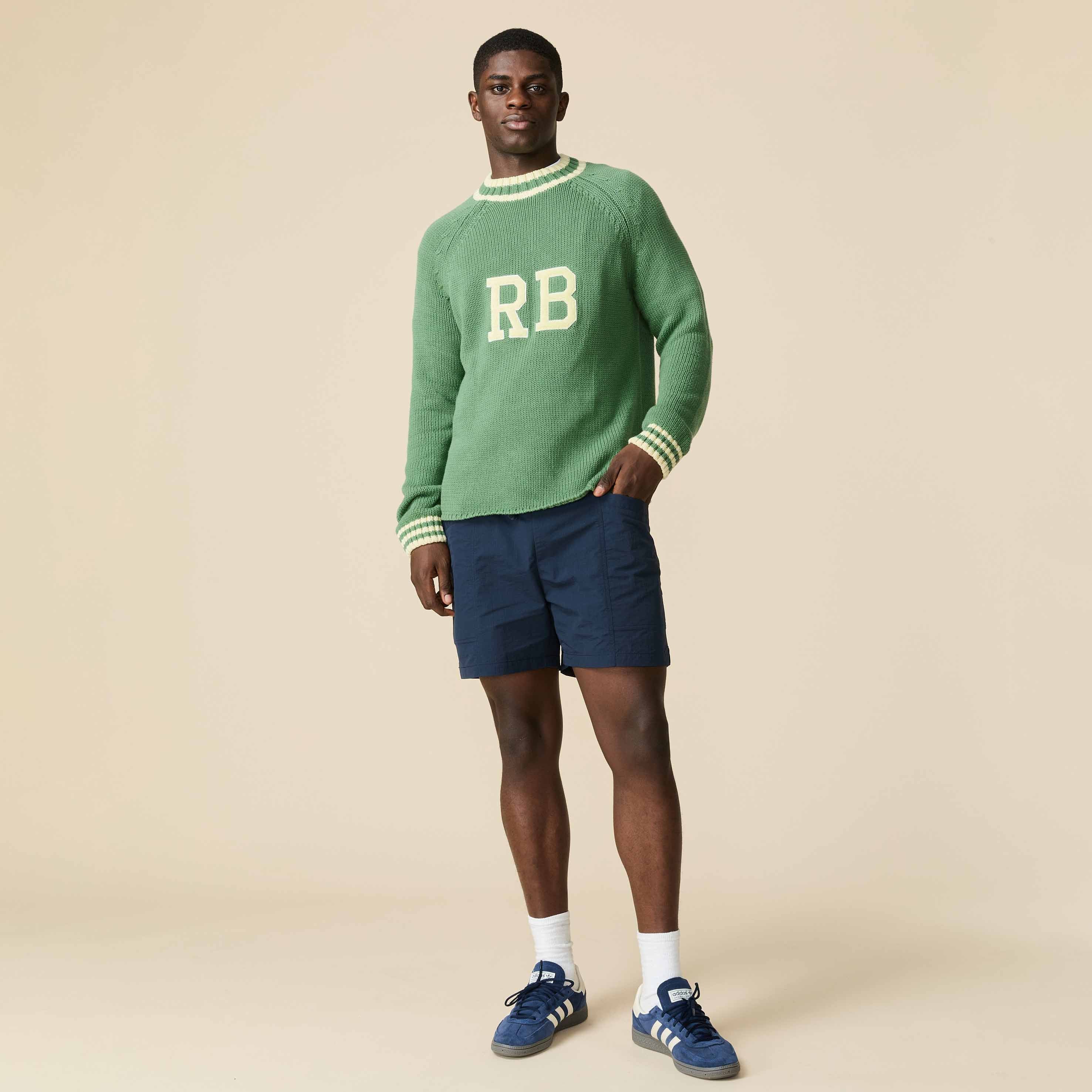 • Men’s collegiate-inspired cotton crewneck sweater with contrasting trim and varsity letter-style chenille patches