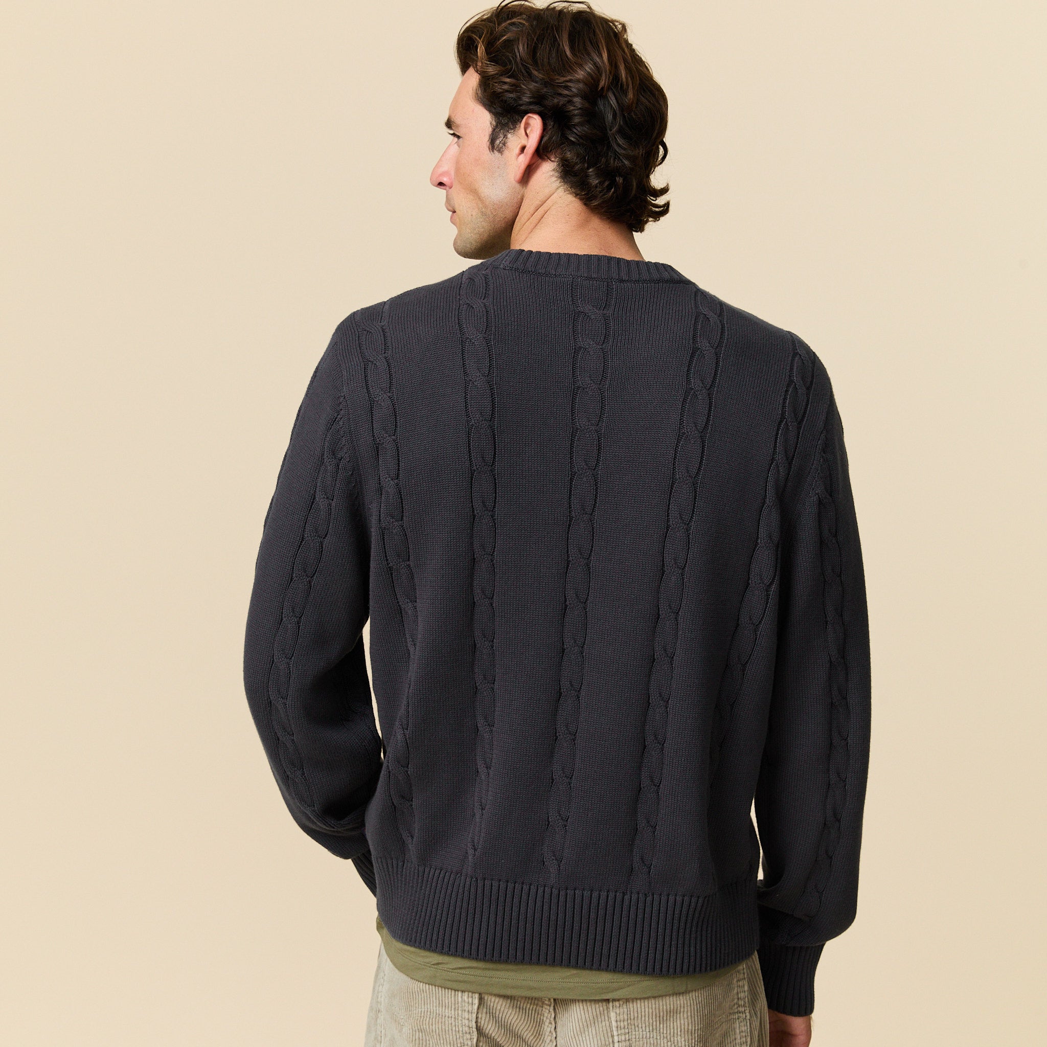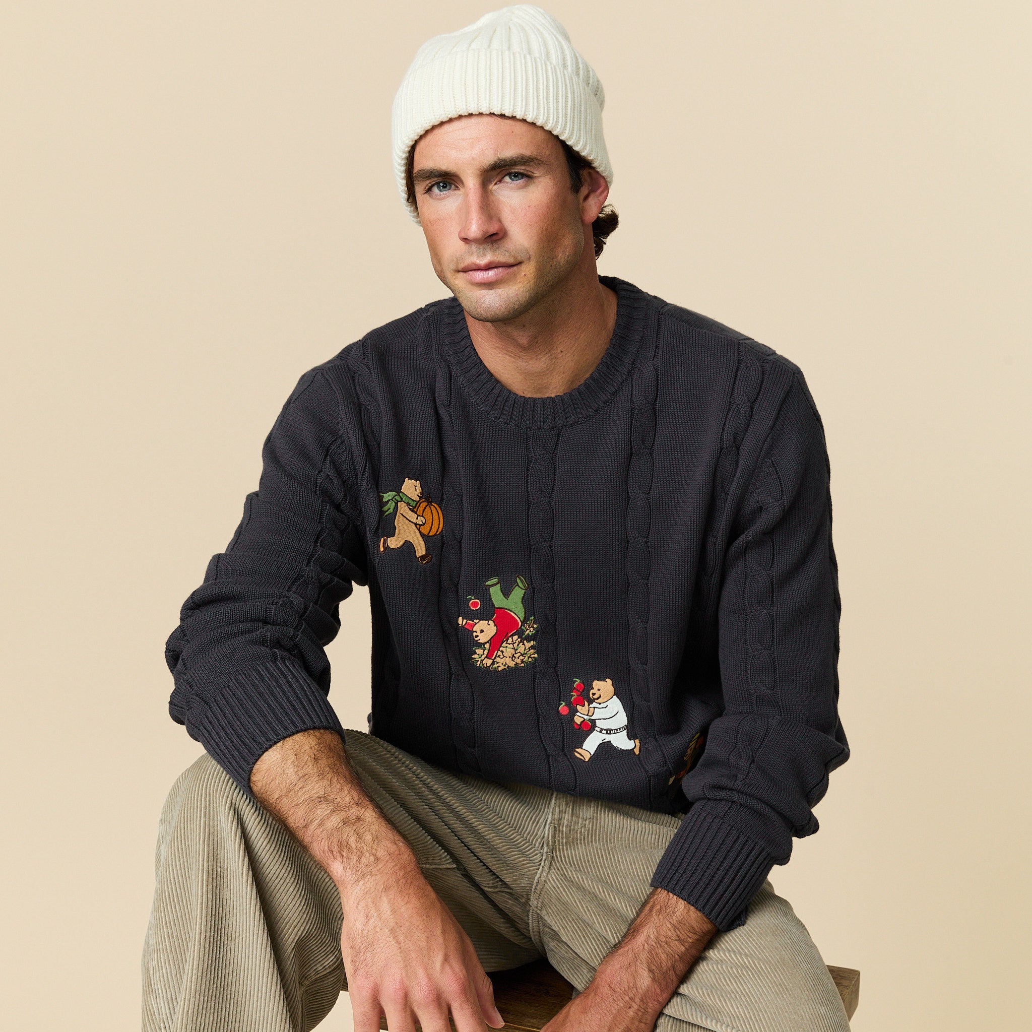 • Men’s vintage-inspired cable-knit crewneck sweater with an embroidered autumnal bears motif Cable-knit.