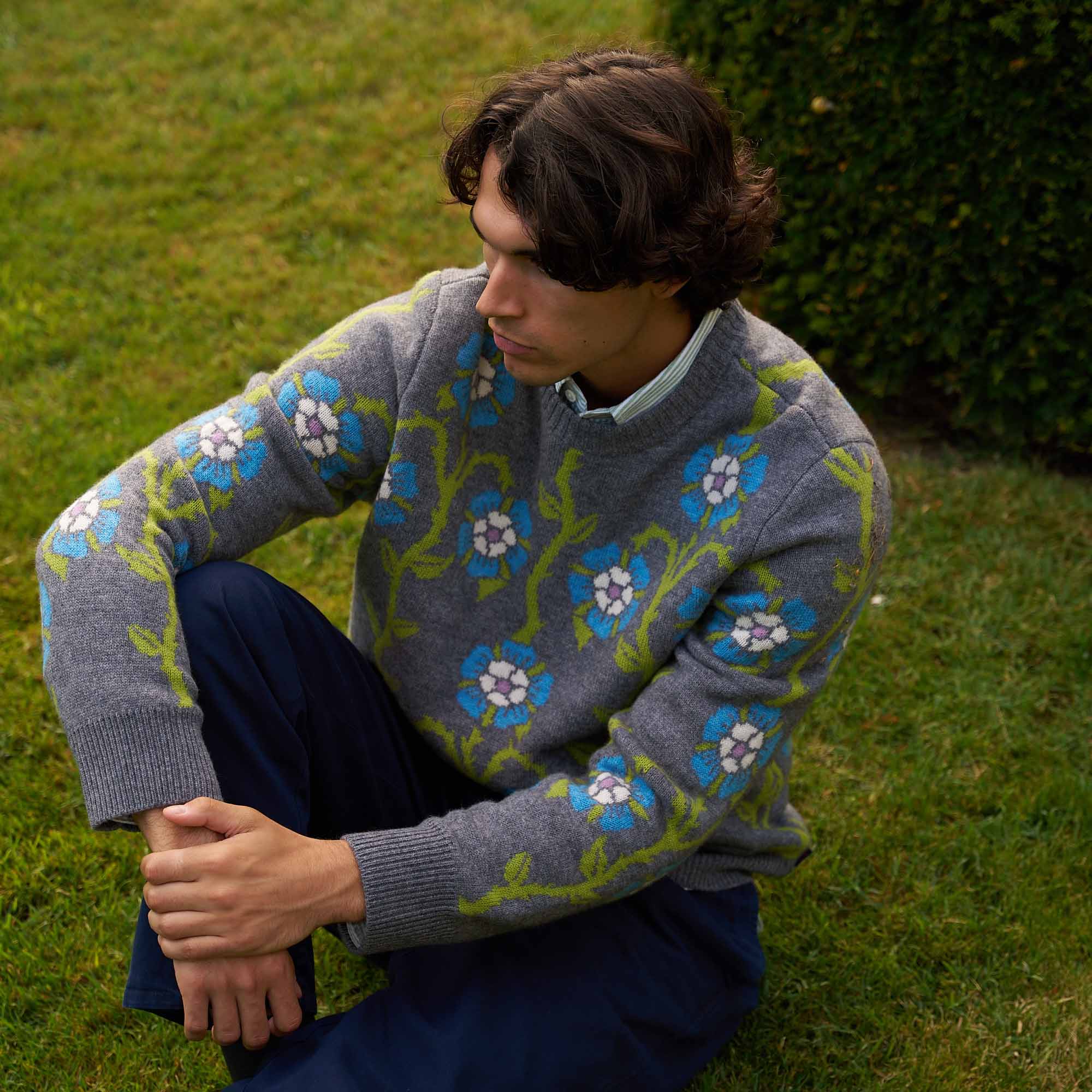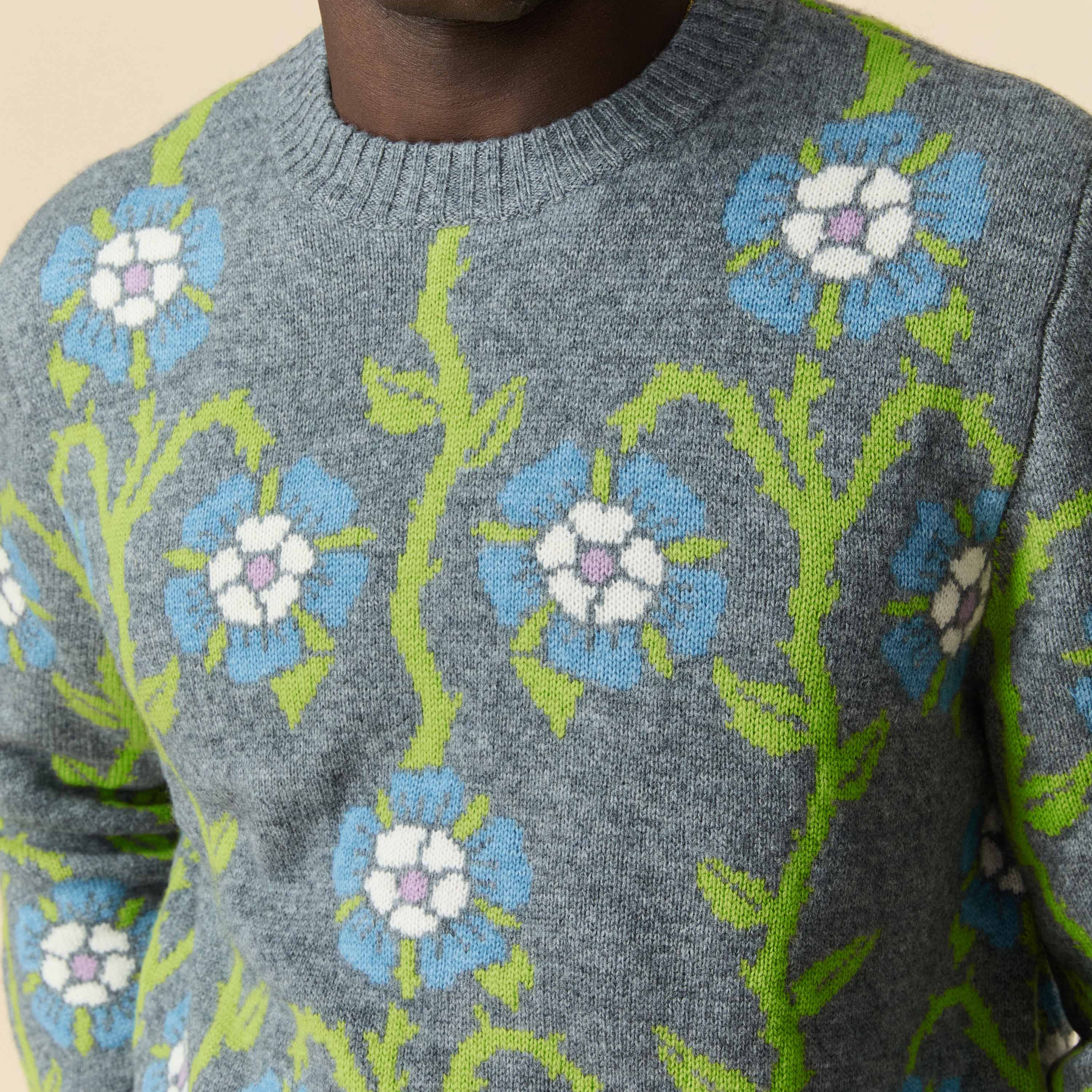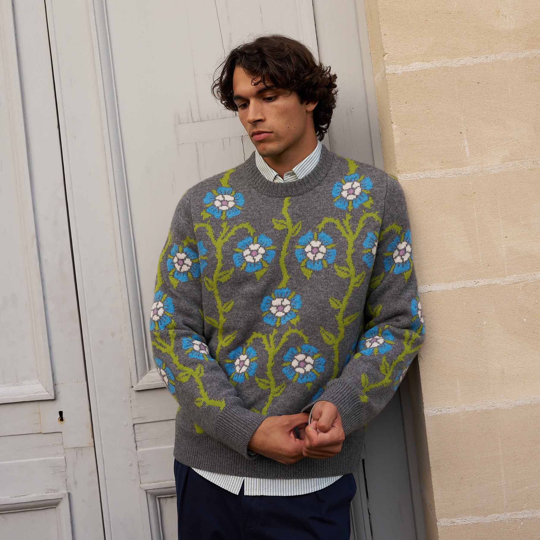 - Men’s wool-and-cashmere blend crewneck sweater with an all-over Tudor rose motif