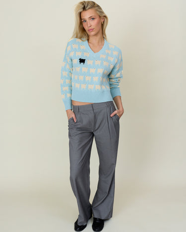 Women's Cotton Linen V-Neck Sheep Sweater Blue