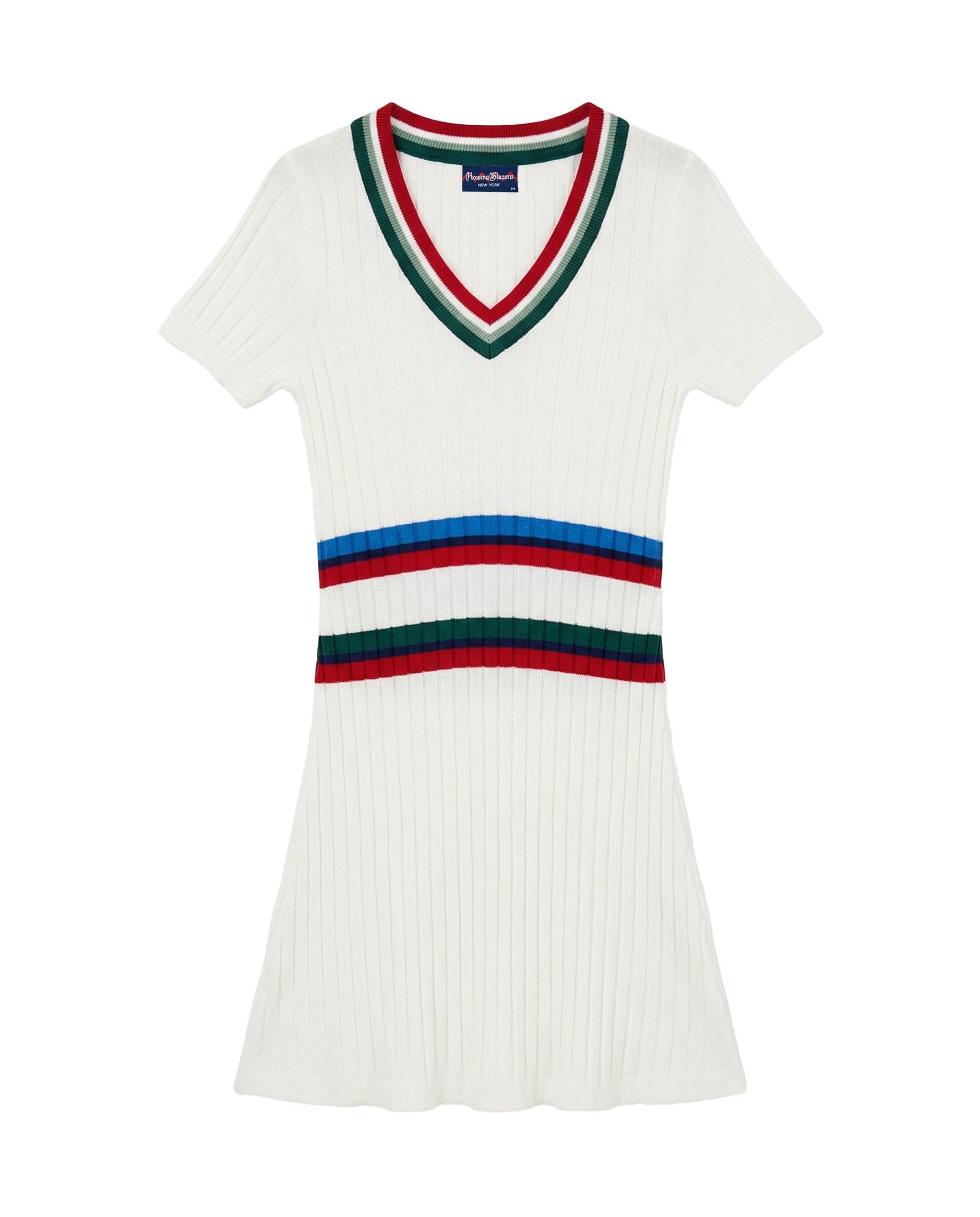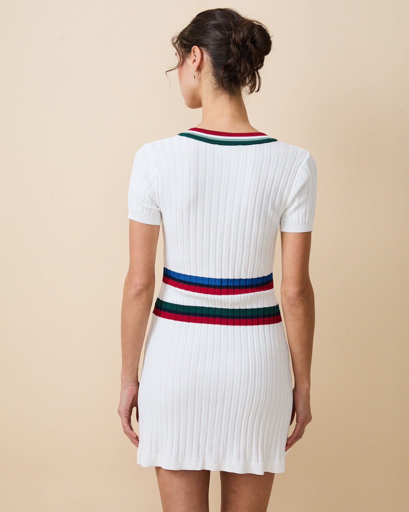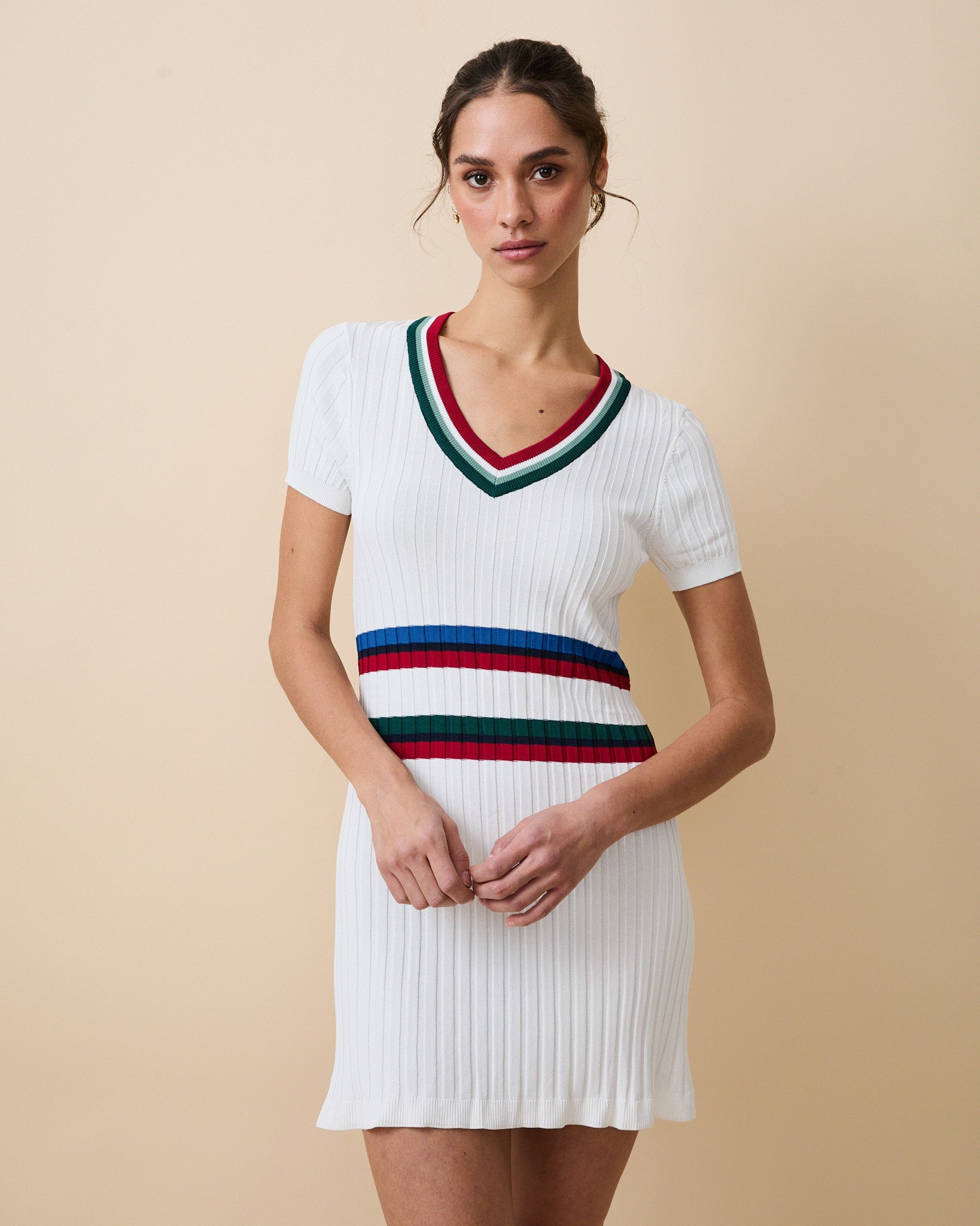 - Women’s fitted V-neck sweater dress with pleated skirt