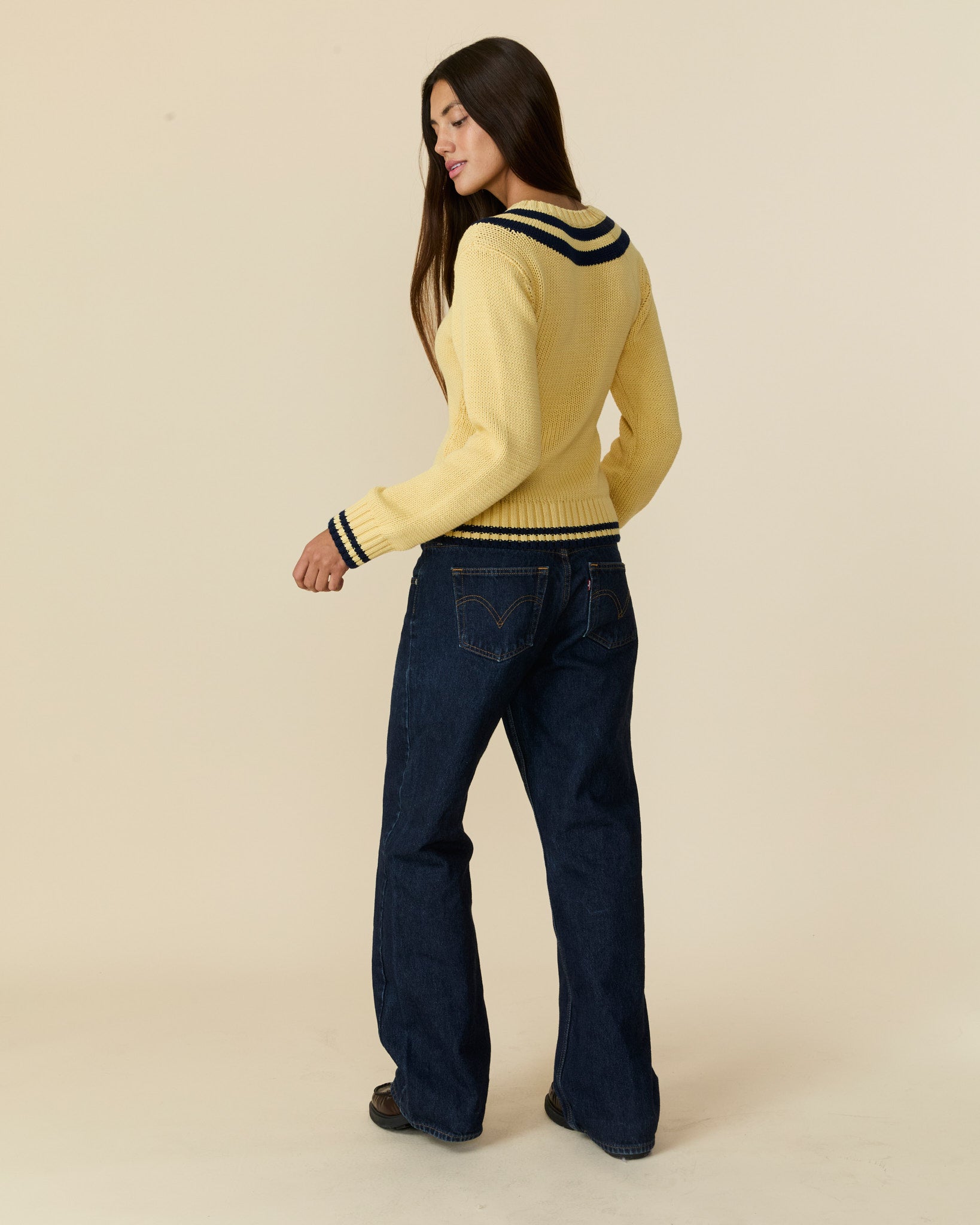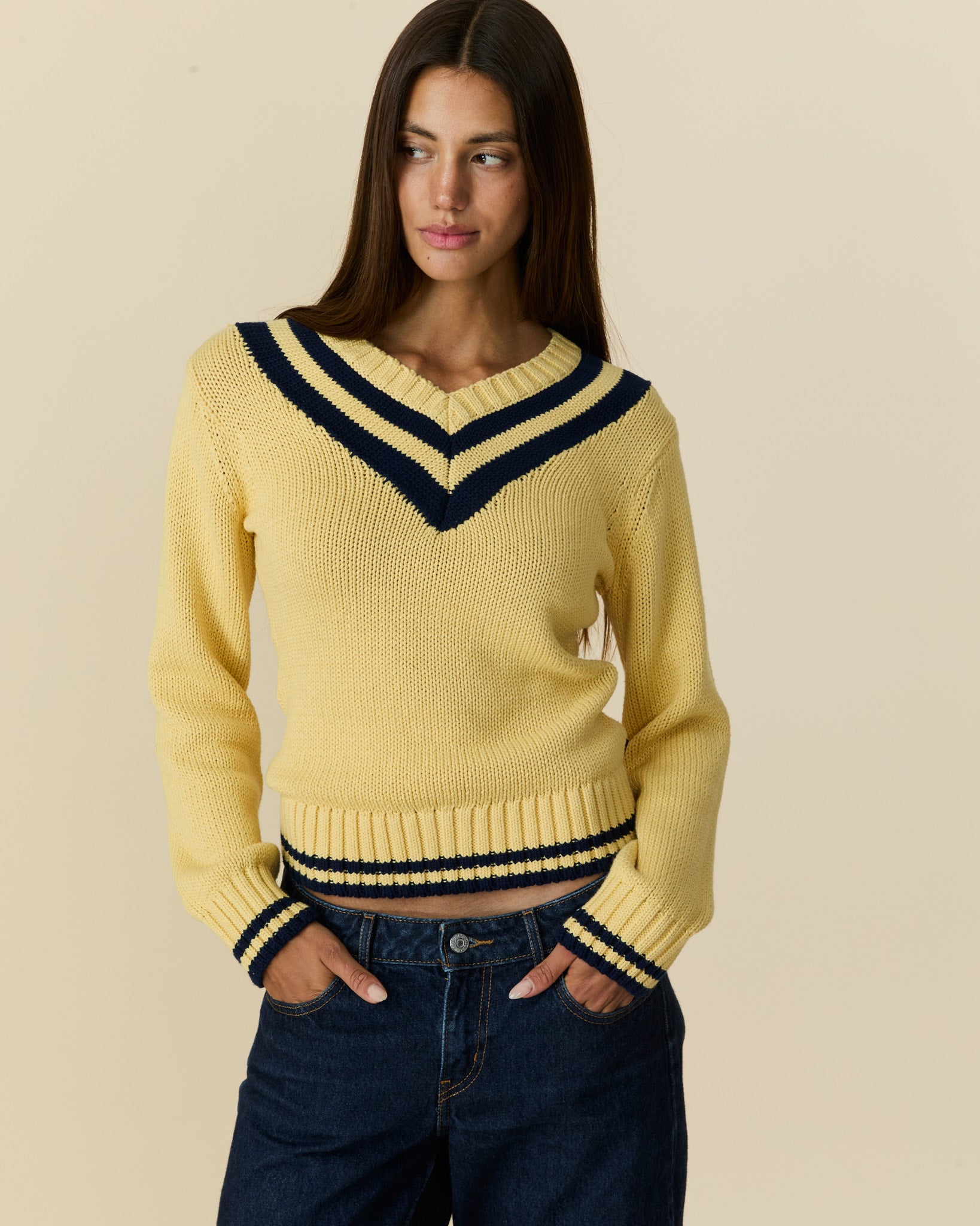 - Women’s collegiate-inspired cotton V-neck sweater with contrasting trim and varsity letter-style chenille patches