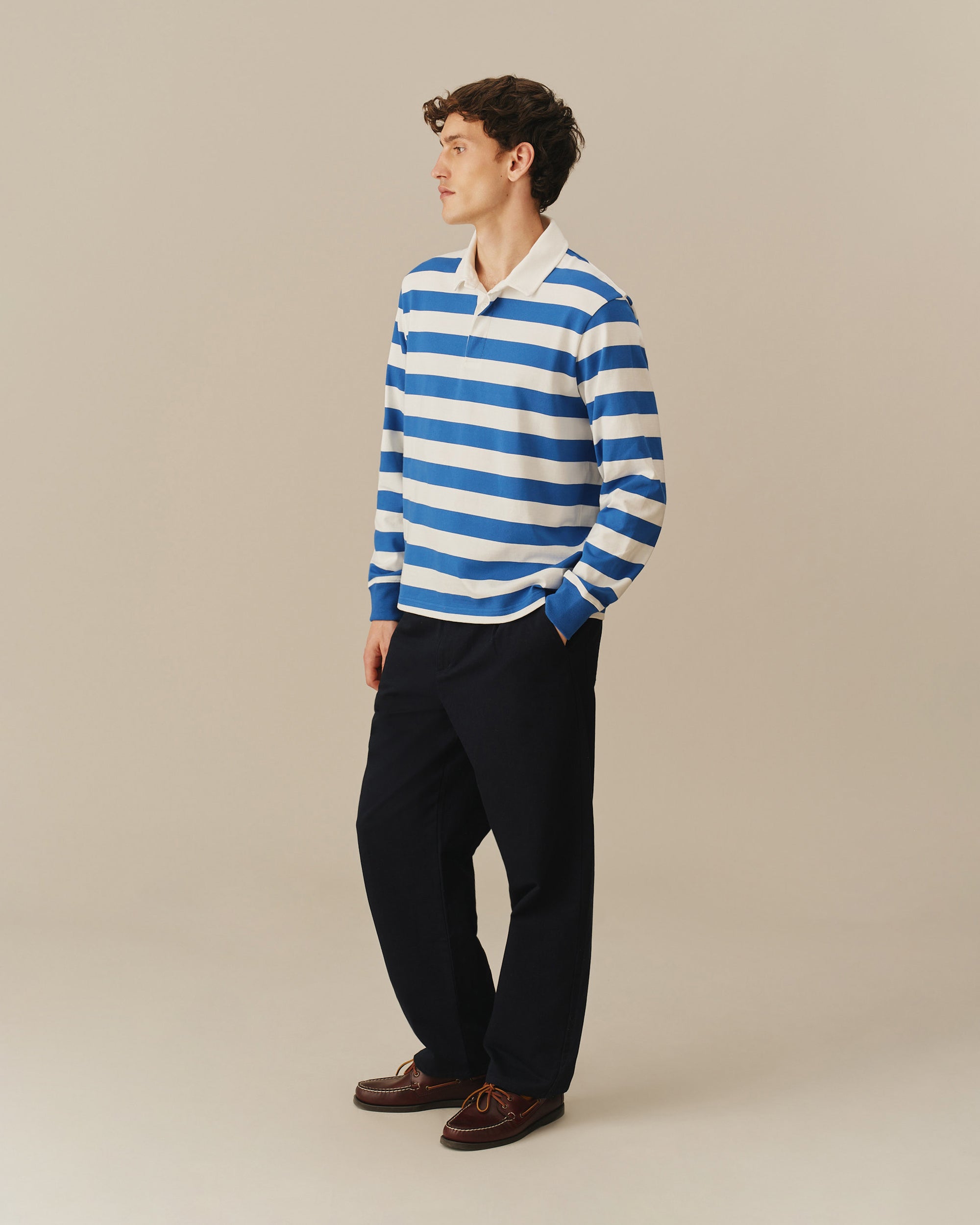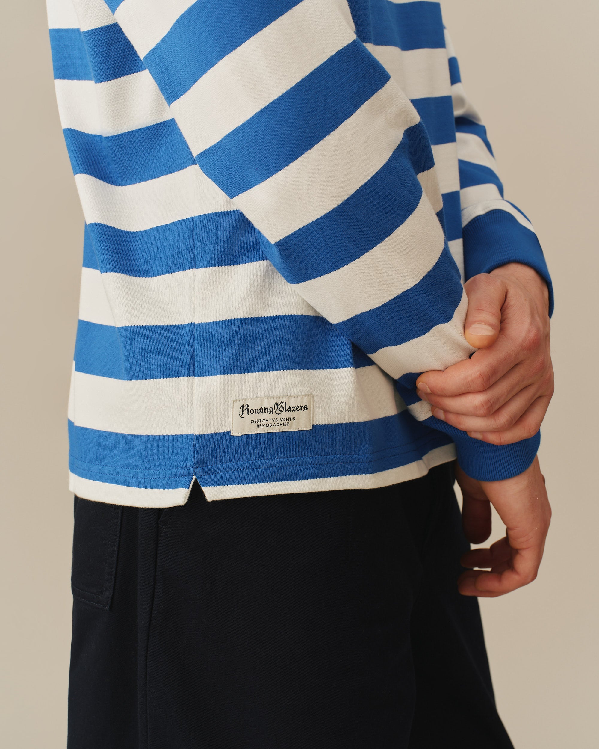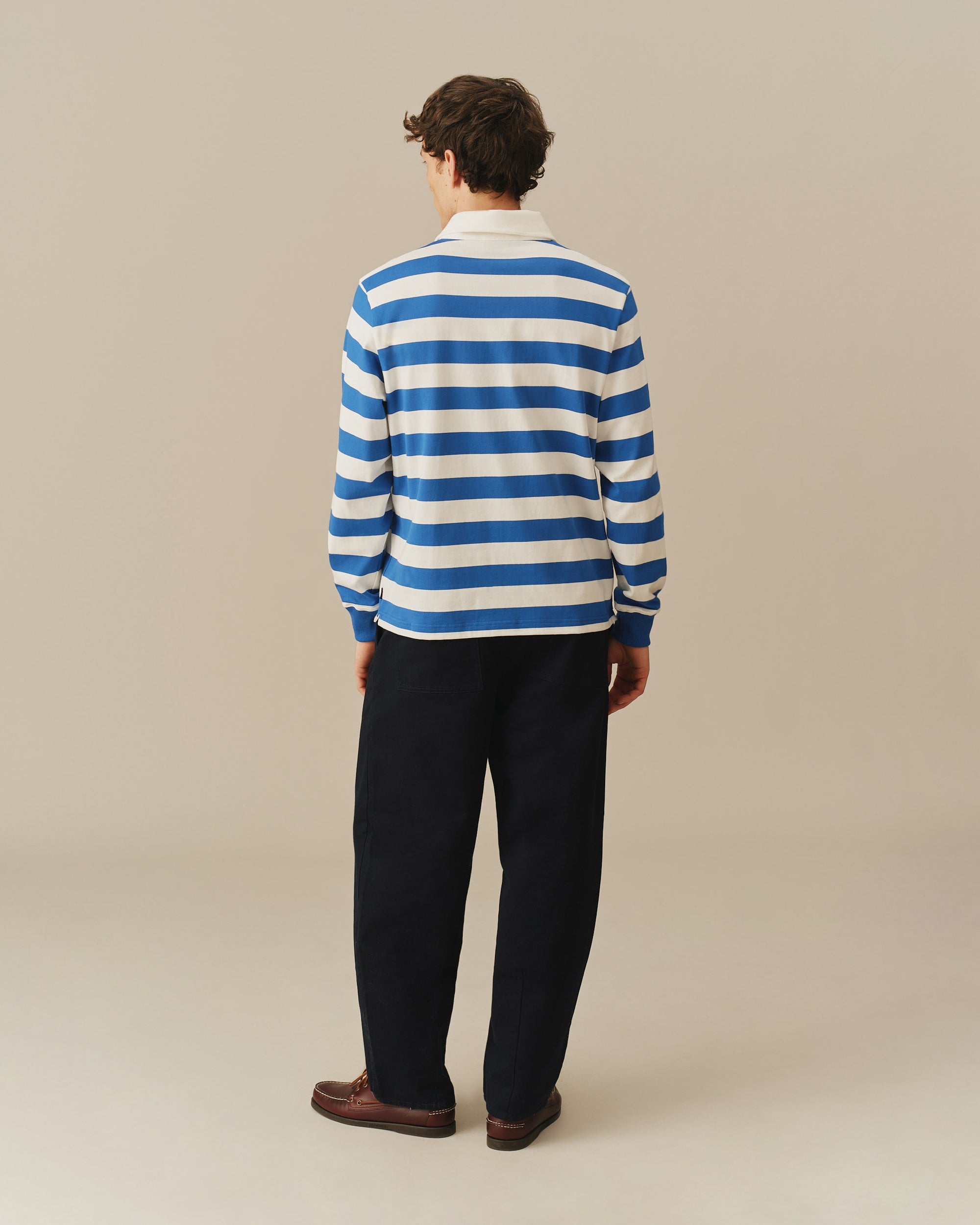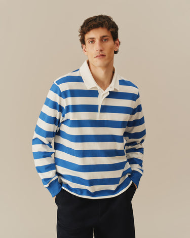 - Men's classic cobalt blue and white striped rugby