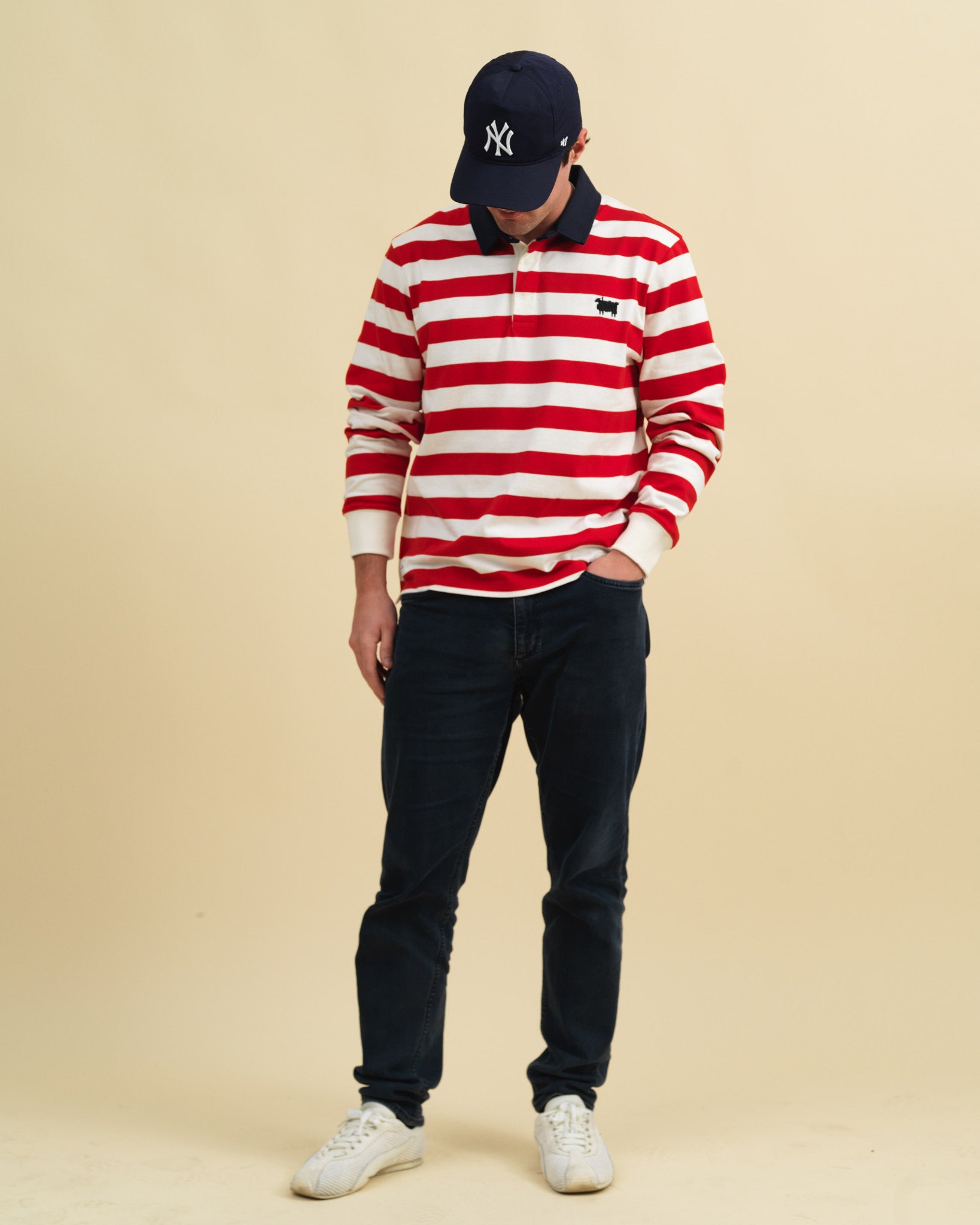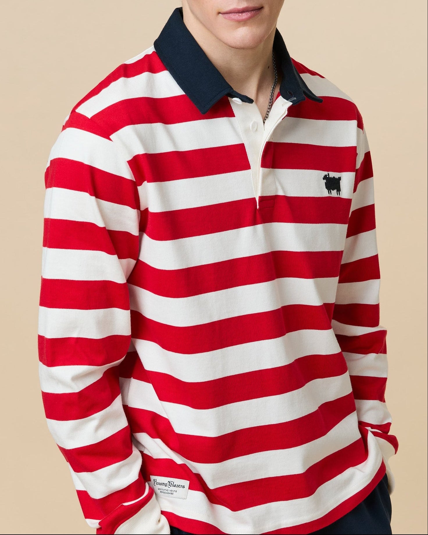 - 1x1 rib-knit collar and cuffs. Hidden 3-button placket. Split hems. Embroidered graphics. RB tag at right hip