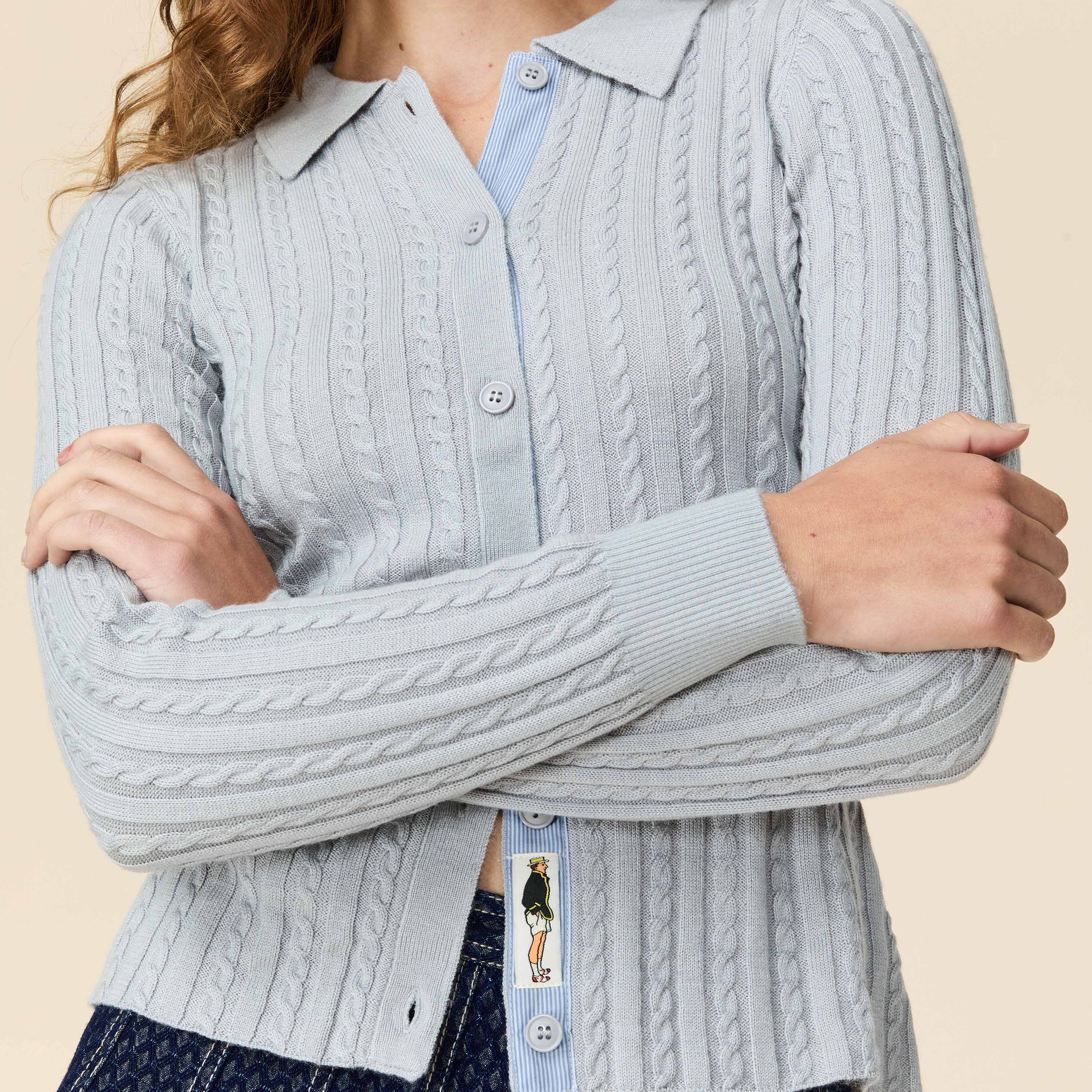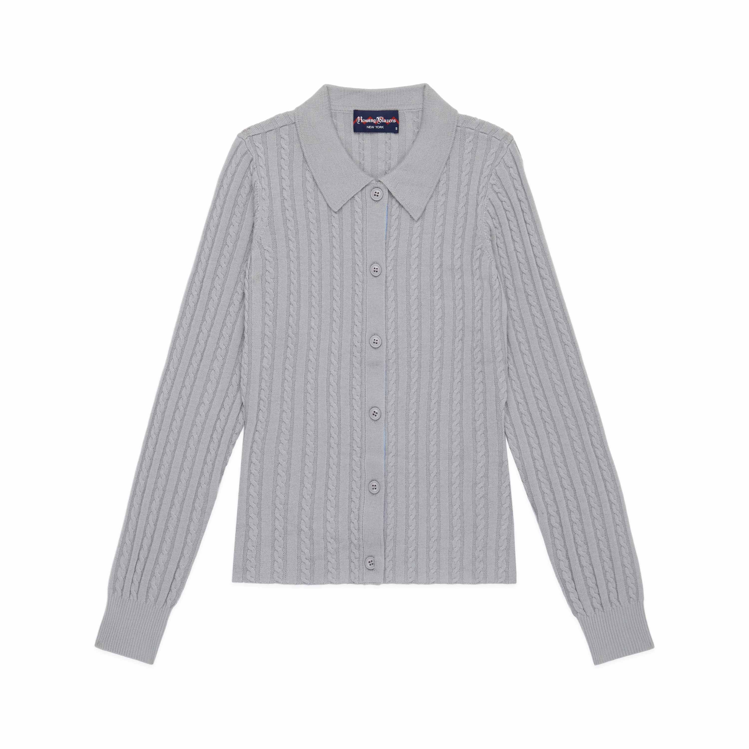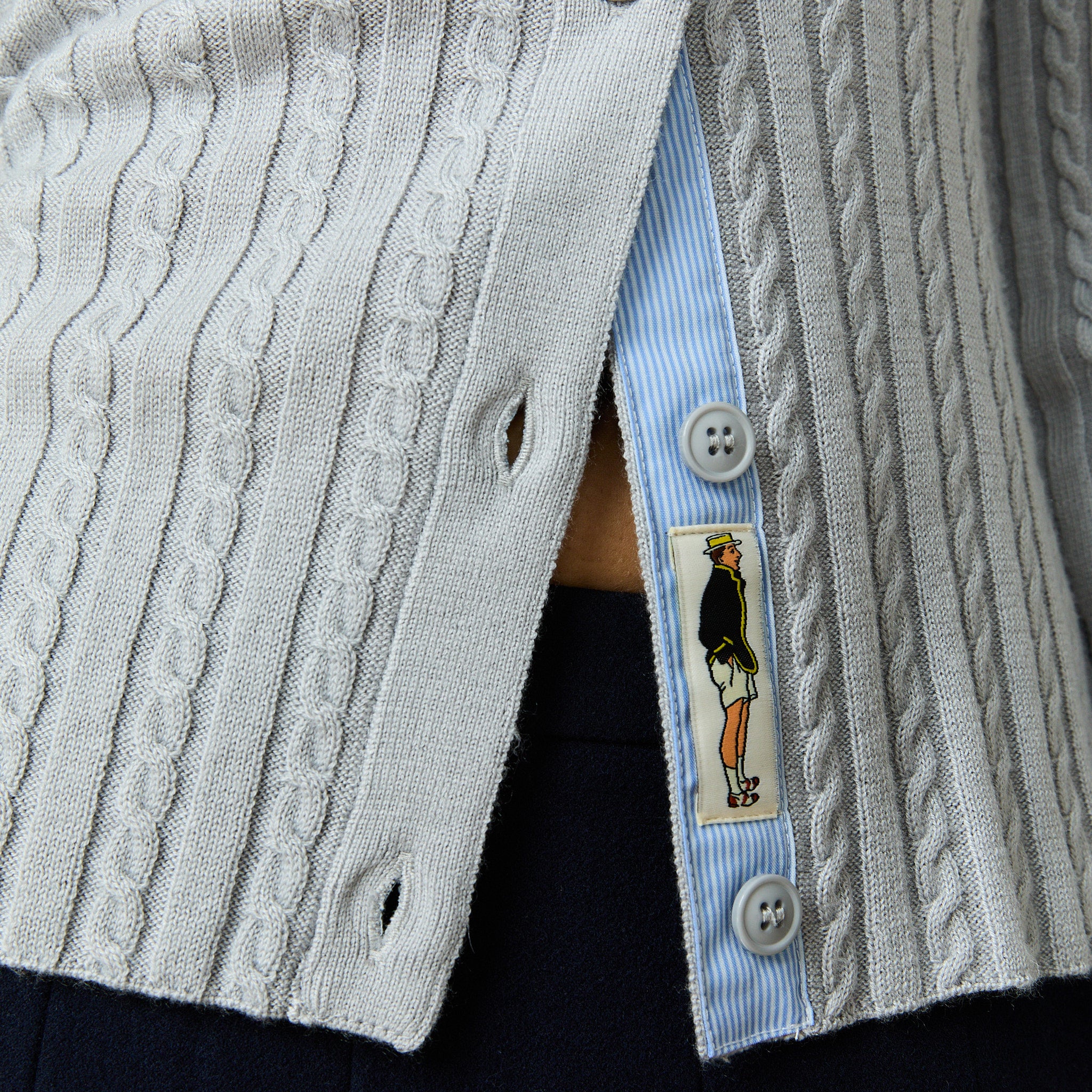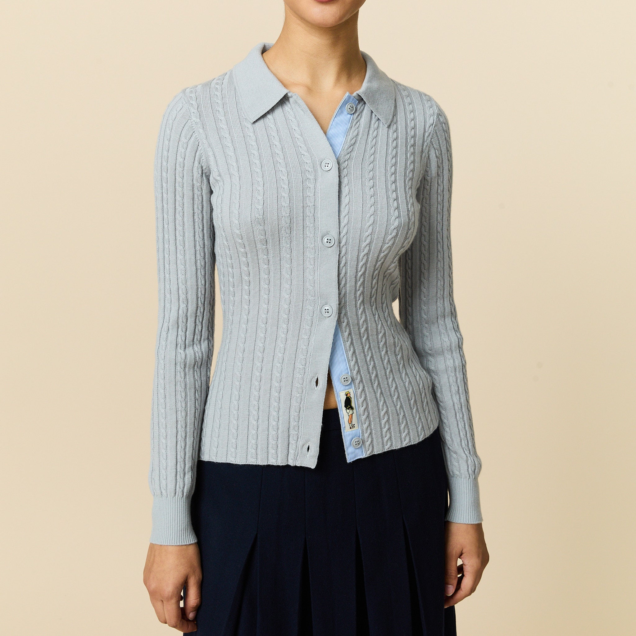 - Ribbed collar and cuffs. Contrasting 6-button placket with hidden Henry tag. Embroidered detailing