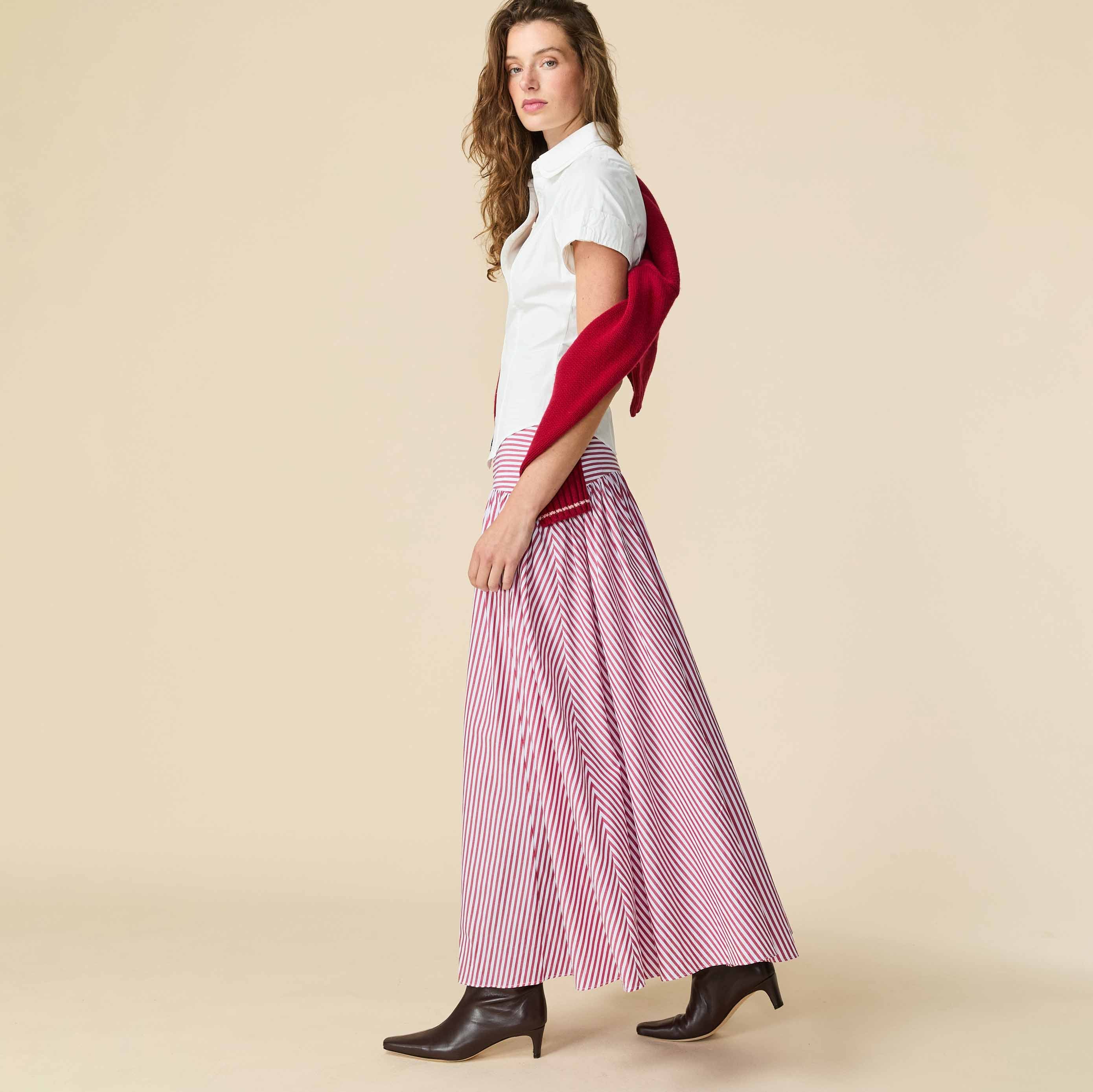 - Women’s pleated cotton poplin maxi-length skirt in red pinstripes